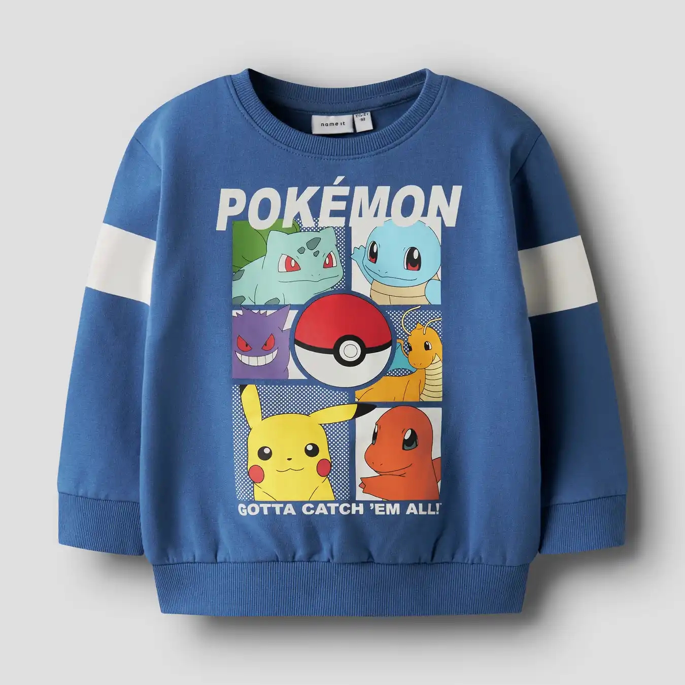 Name It blusen er blå med print foran af de kendte Pokemonfigurer og en pokéball.