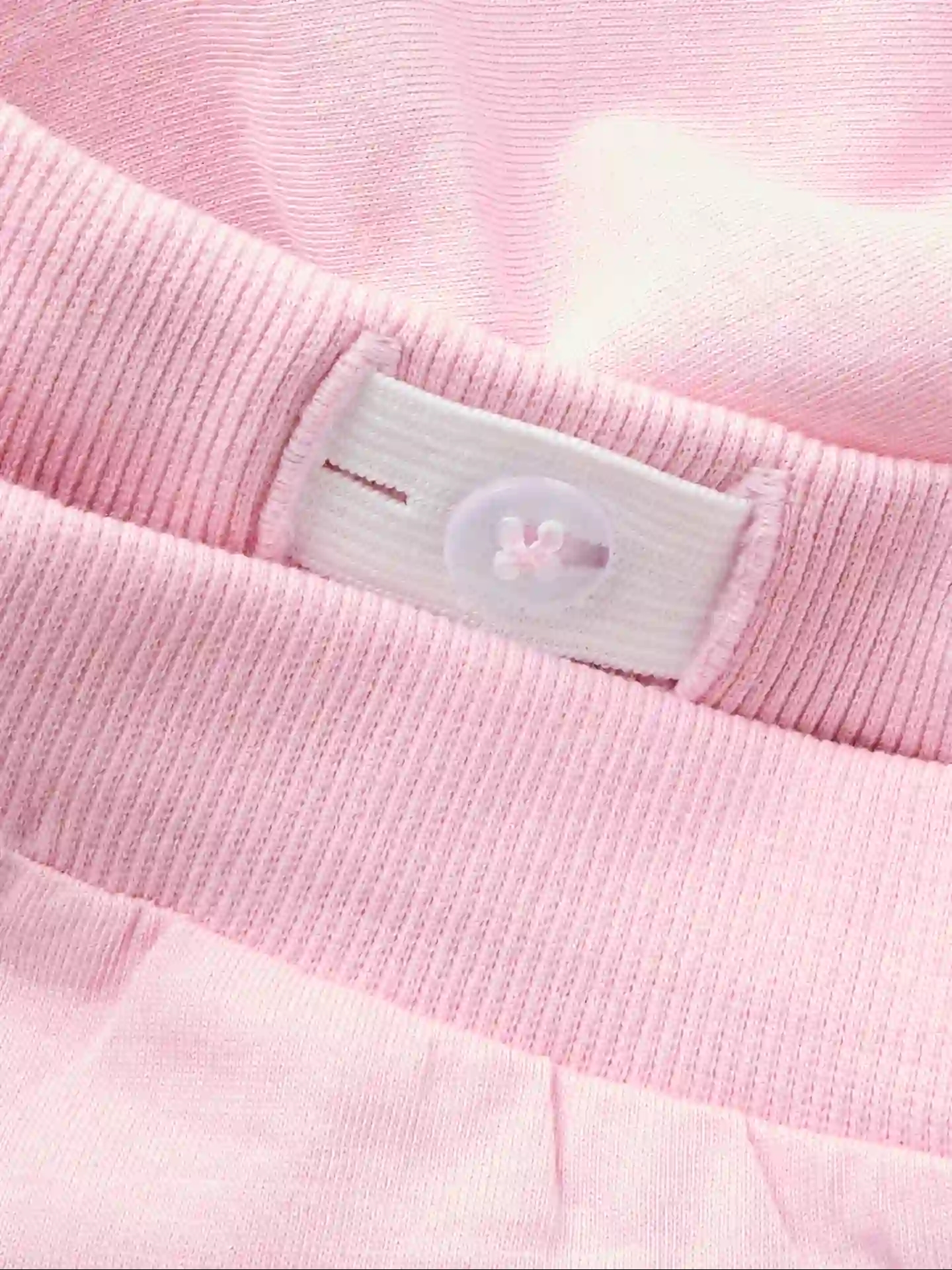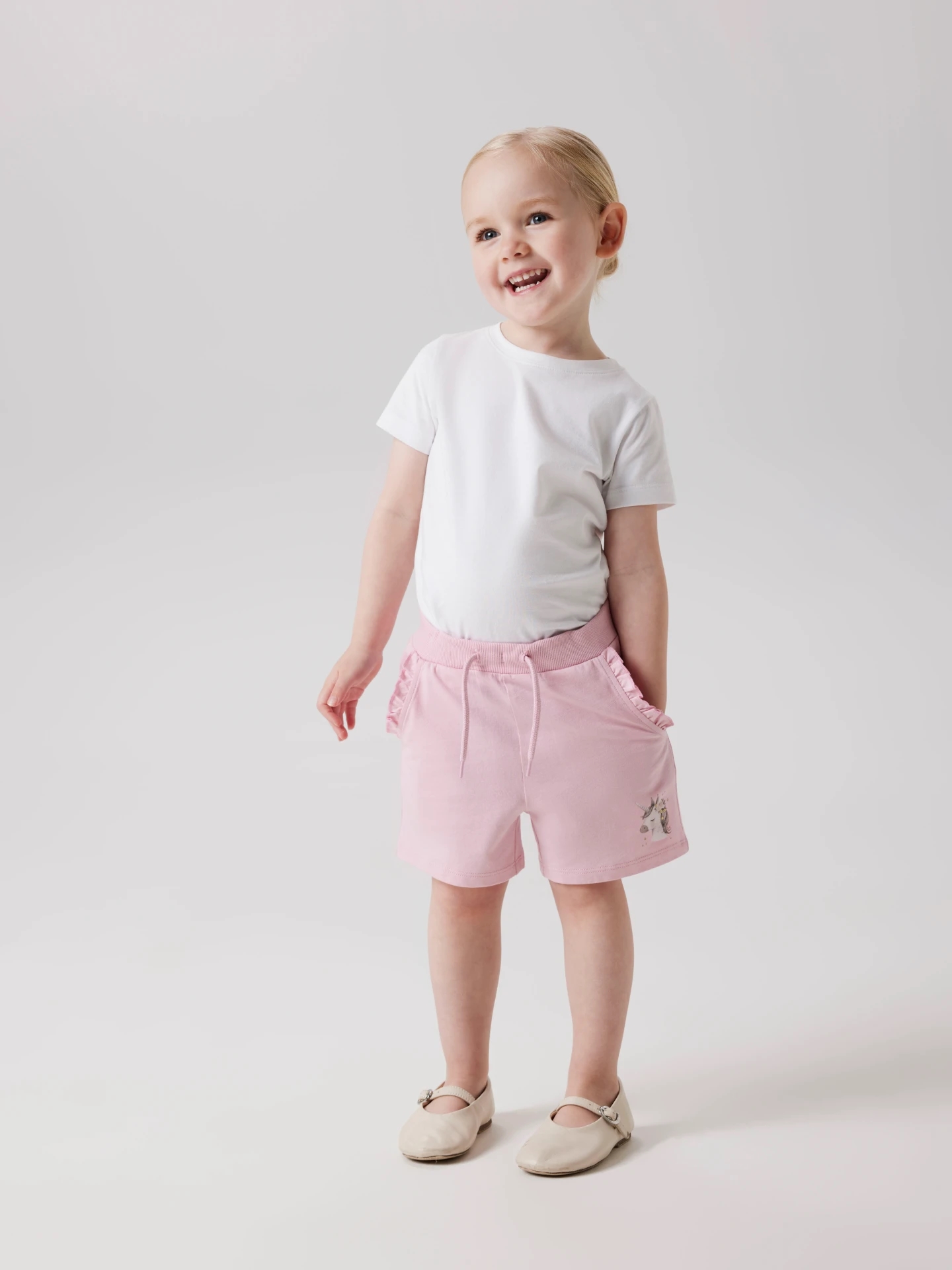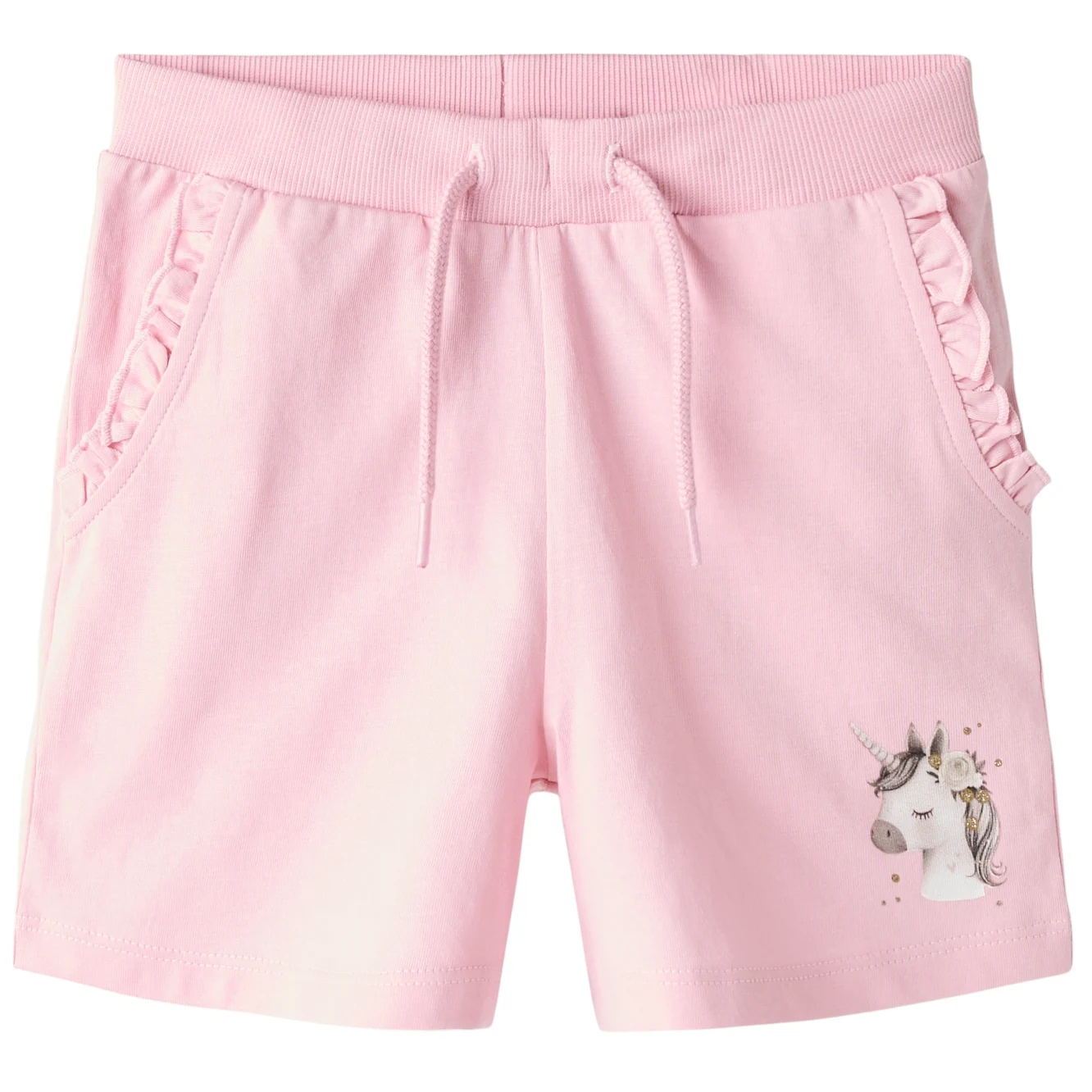 Søde Name It shorts i pink med print foran af en enhjørning, samt små flæser ved lommerne.