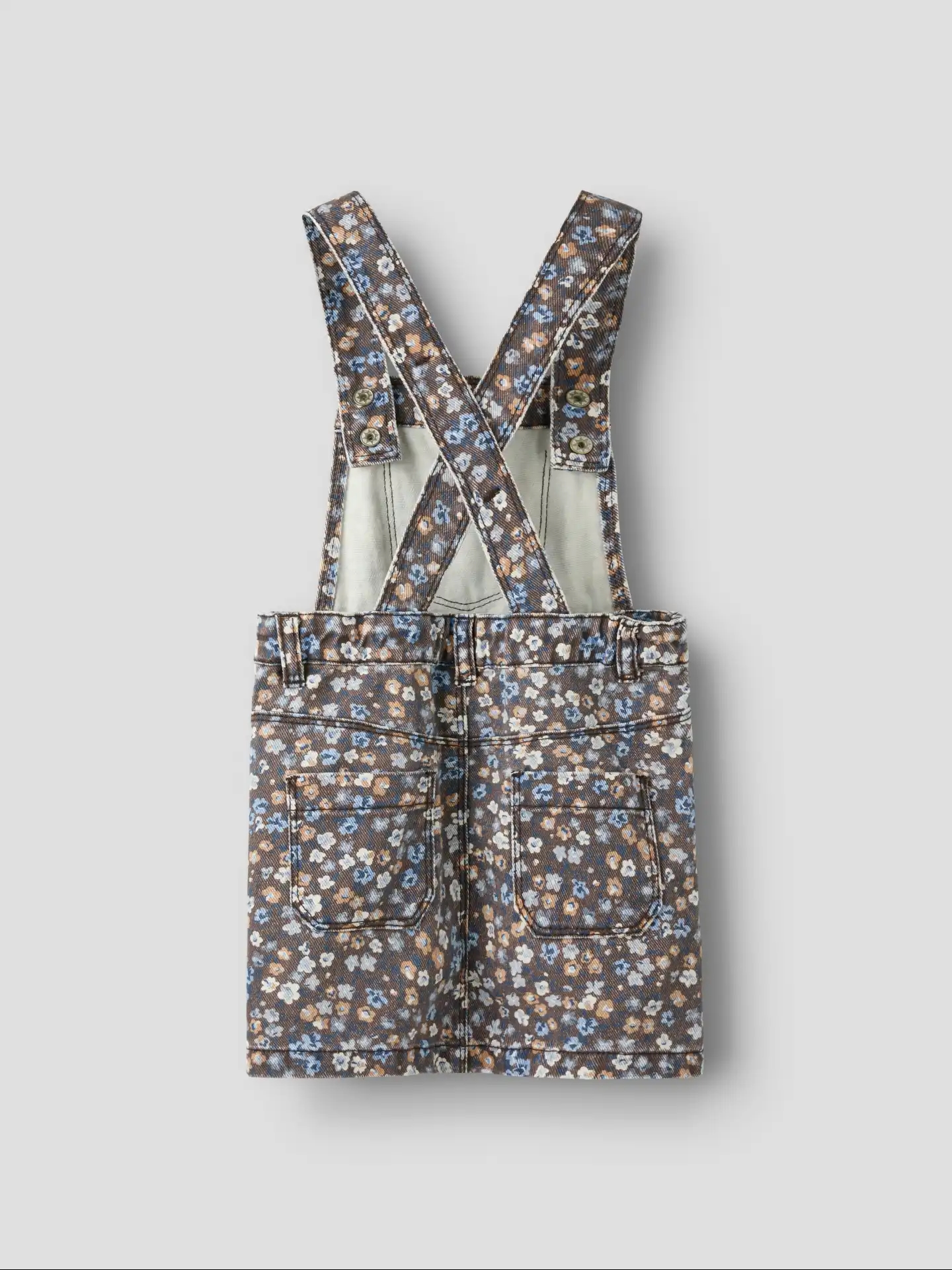 En sød Name It spencer i brun nuance med blomsterprint i fine blå og gul-orange nuancer.