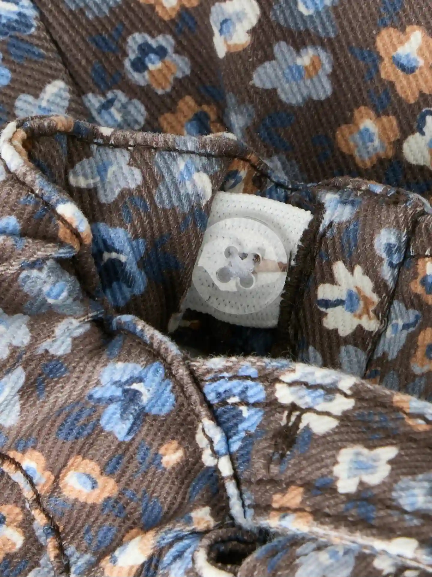 Name It spencerkjolen er i en varm brun nuance, der prydes af fine blomster i blå og gul-orange farver. Kjolen er skabt i en slidstærk bomuldstwill med det klassiske diagonale vævemønster, som gør den både robust og tidløs - ideel til aktiv leg og hverdag i institutionen.
