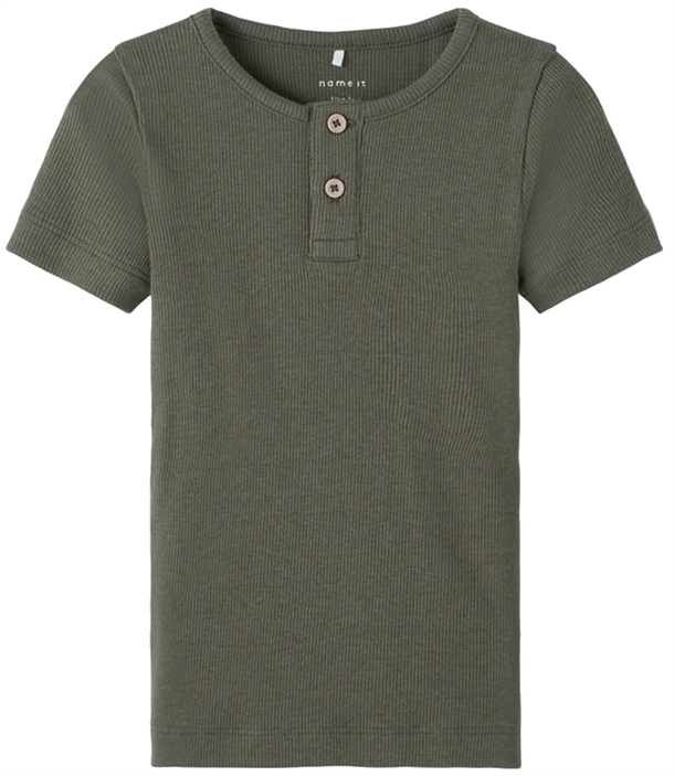 Name It T-shirten er i flot meleret, støvet grøn og er lavet med rib.