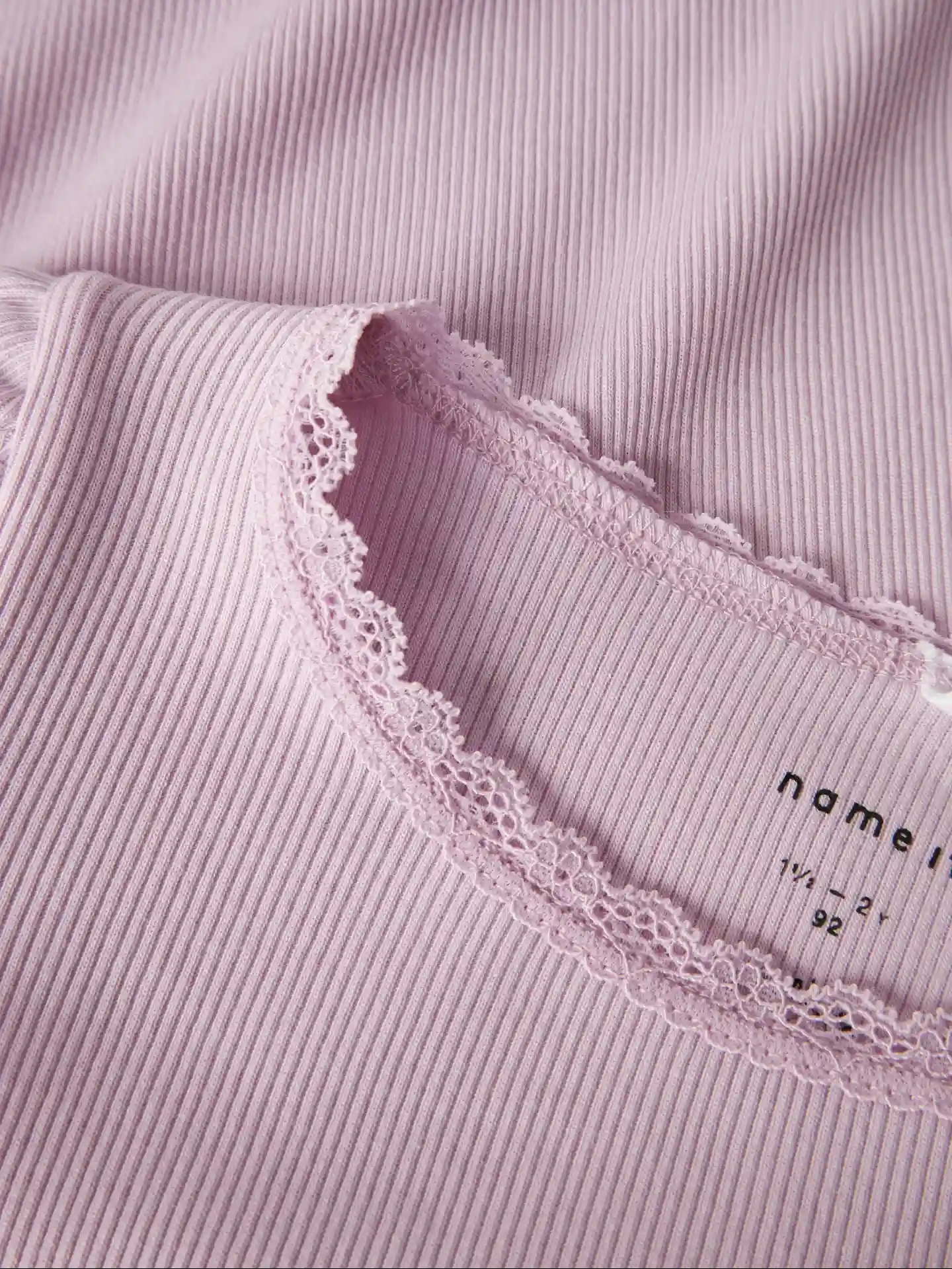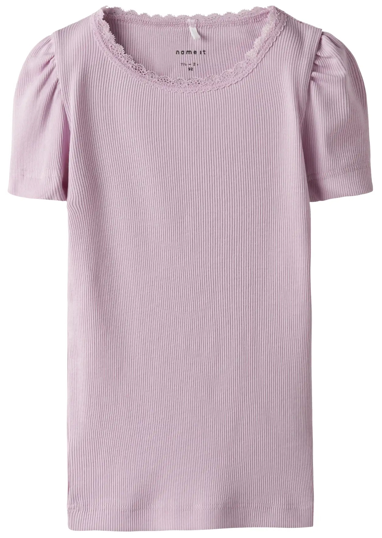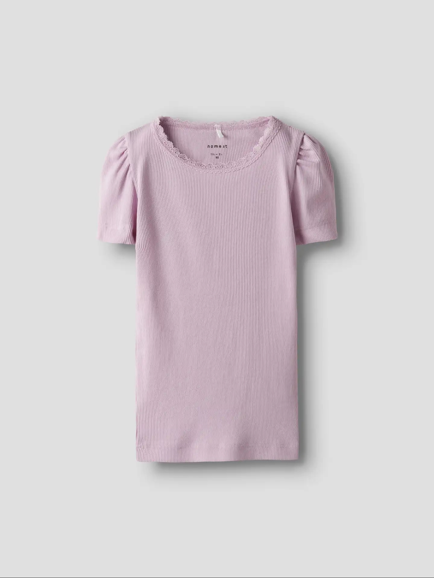 Name It T-shirten er i smuk pastel lilla med rib og en smule puf på ærmerne.