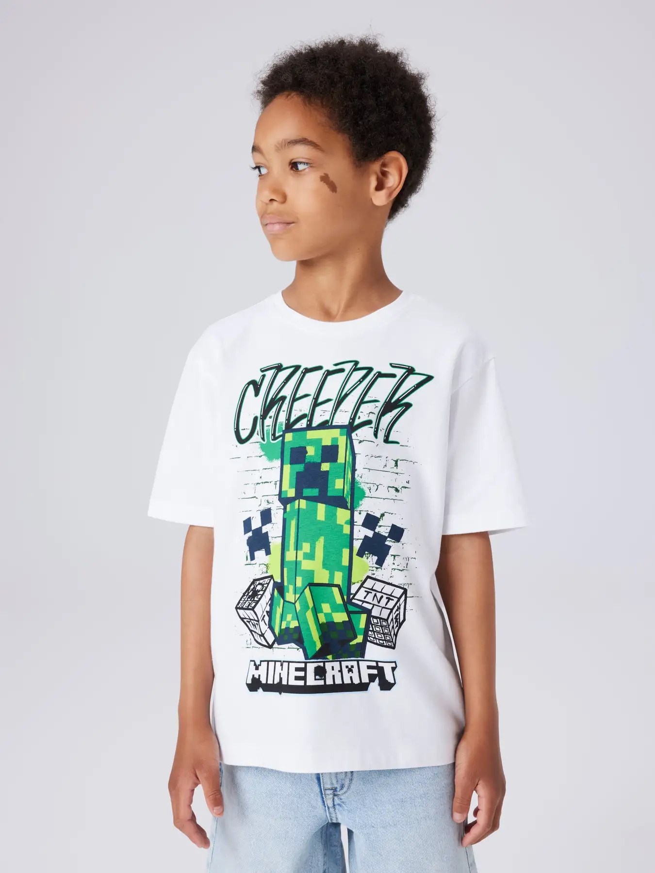 En fed Name It Minecraft T-shirt i hvid med et sejt print af en grøn creeper, TNT og grafitti tekst.