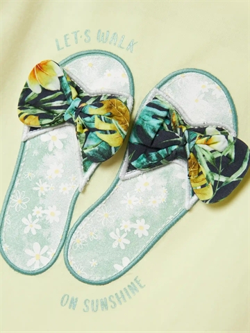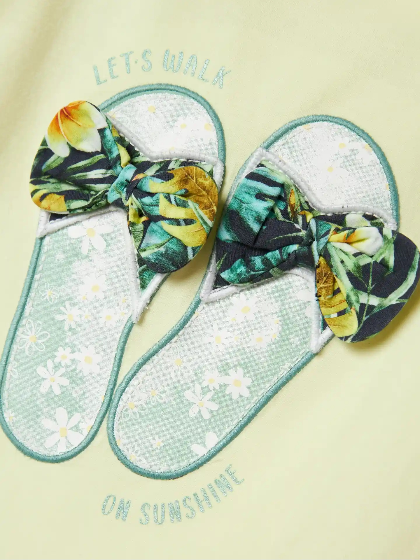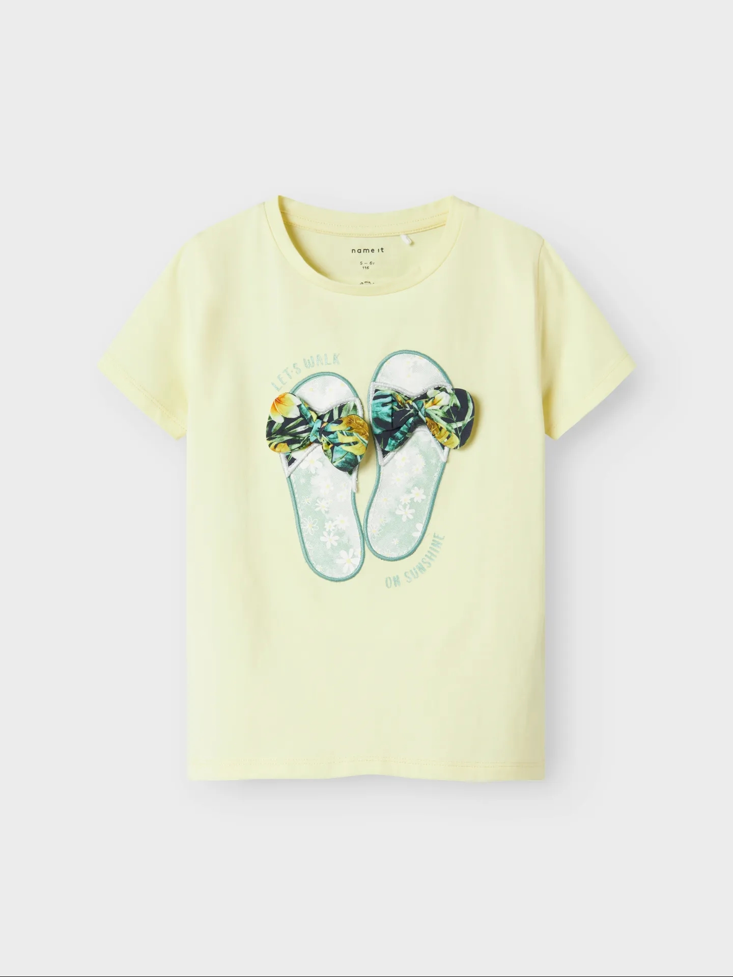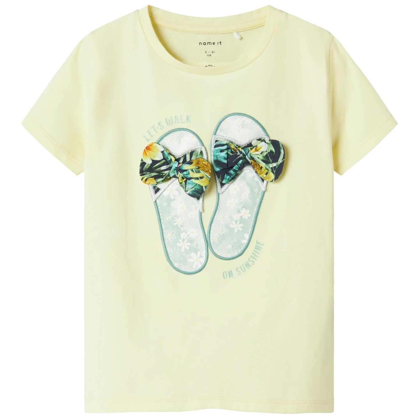 En sød og herlig Name It T-shirt i pastelgul med sandaler foran med blomsterprint, en broderet kant, samt påsyede sløjfer, som gør den så fin og herlig.