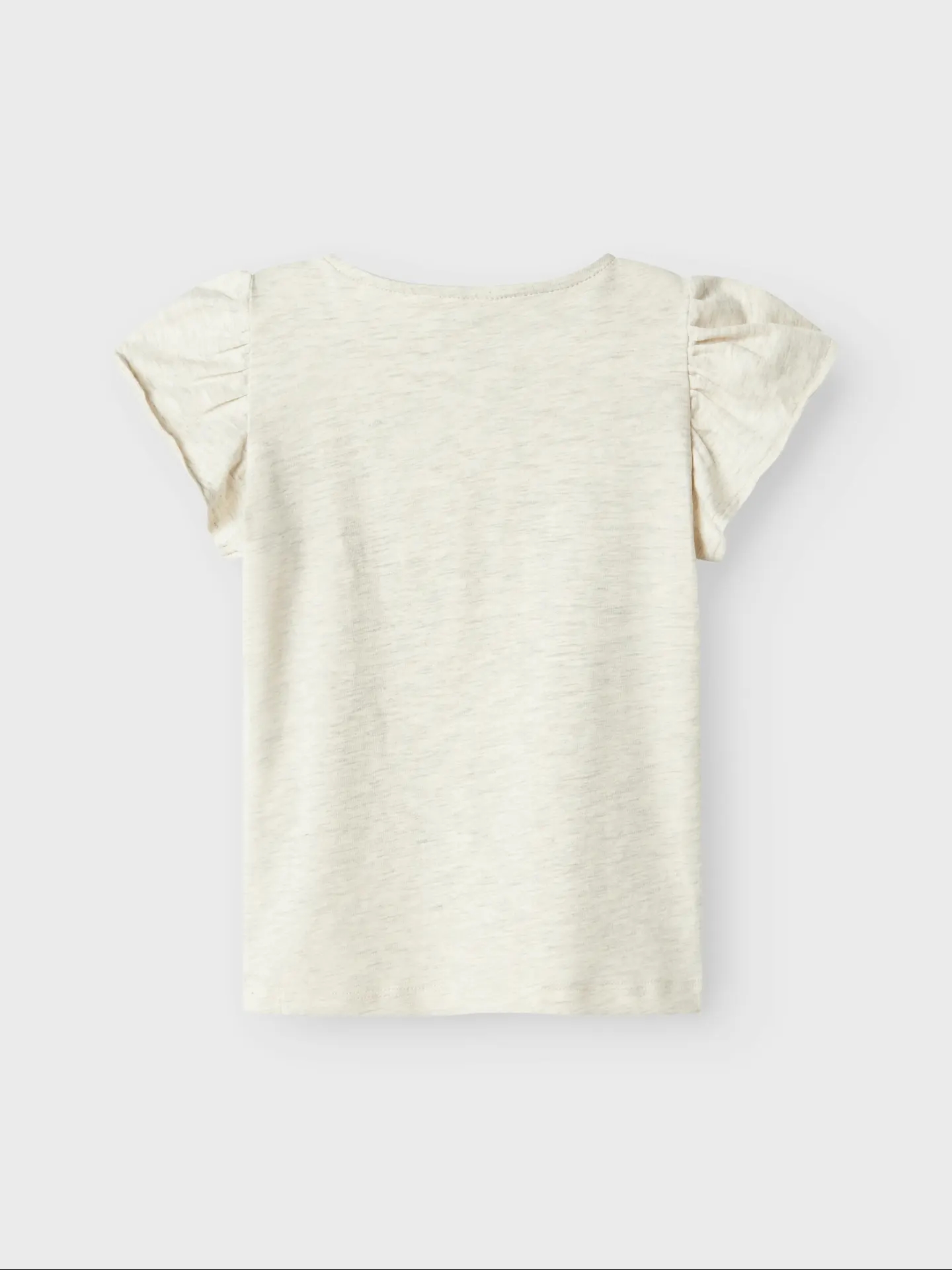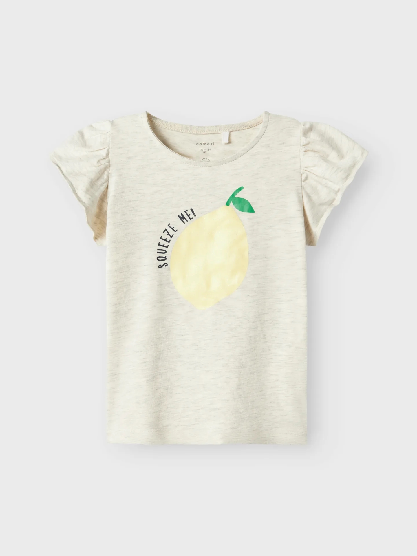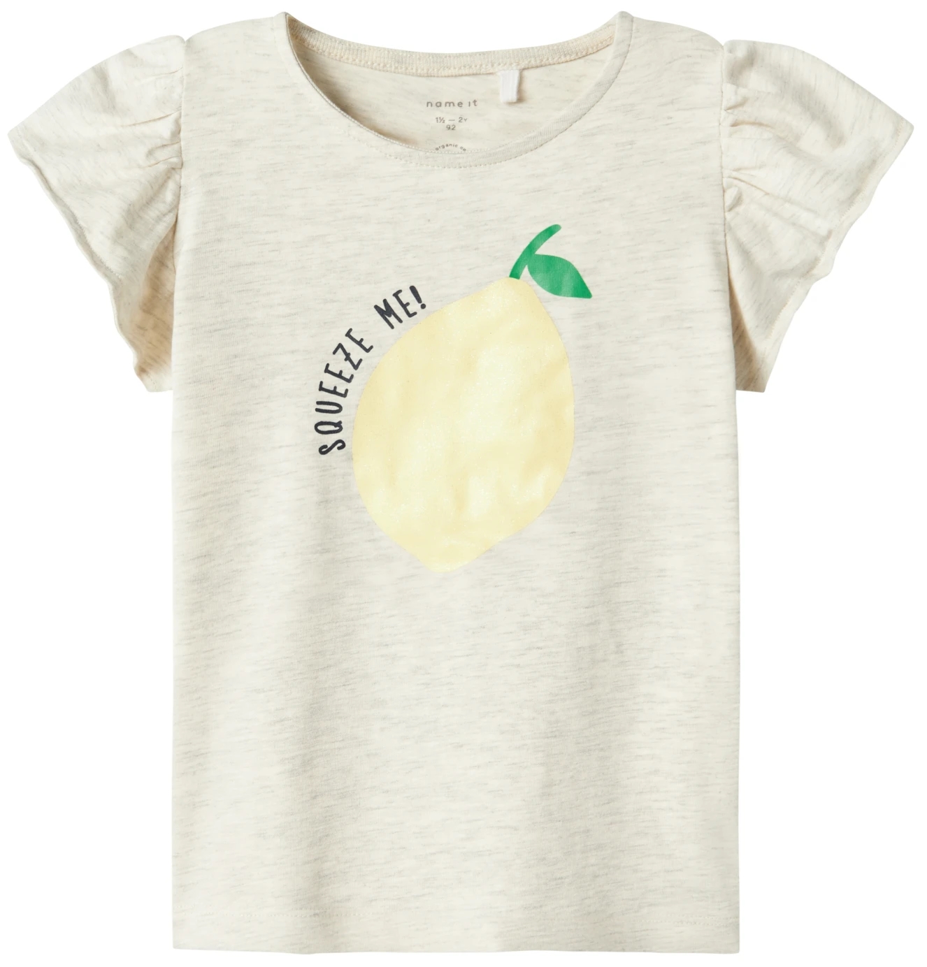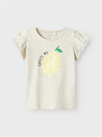 En sød Name It T-shirt i meleret beige med print foran af en gul citron med glimmer i.