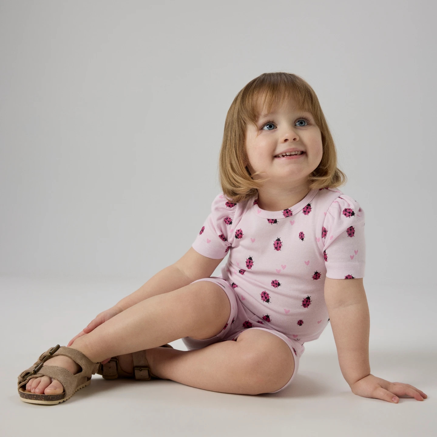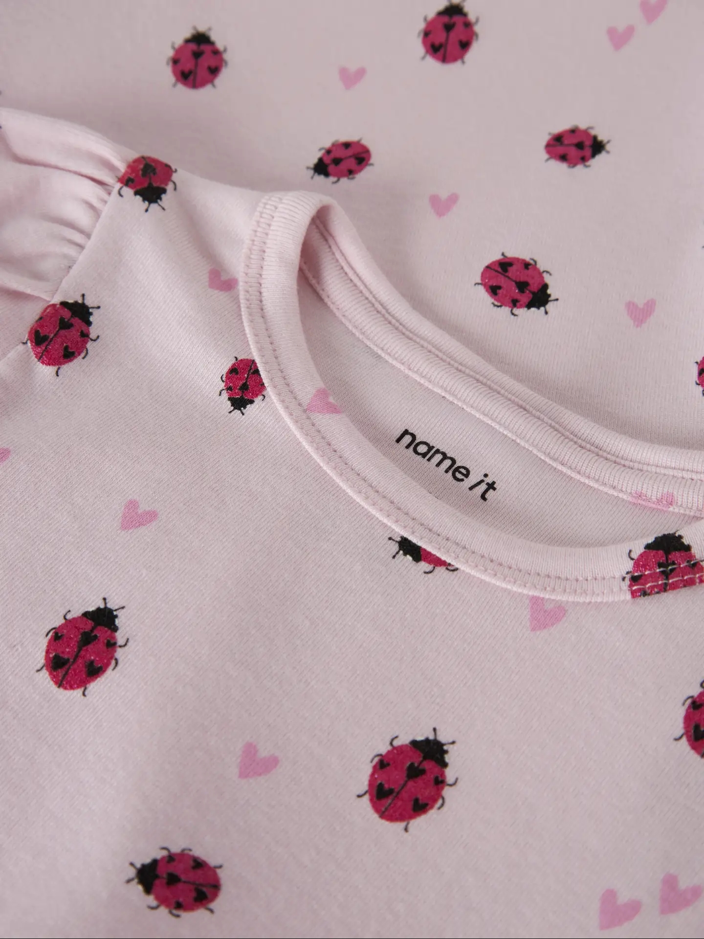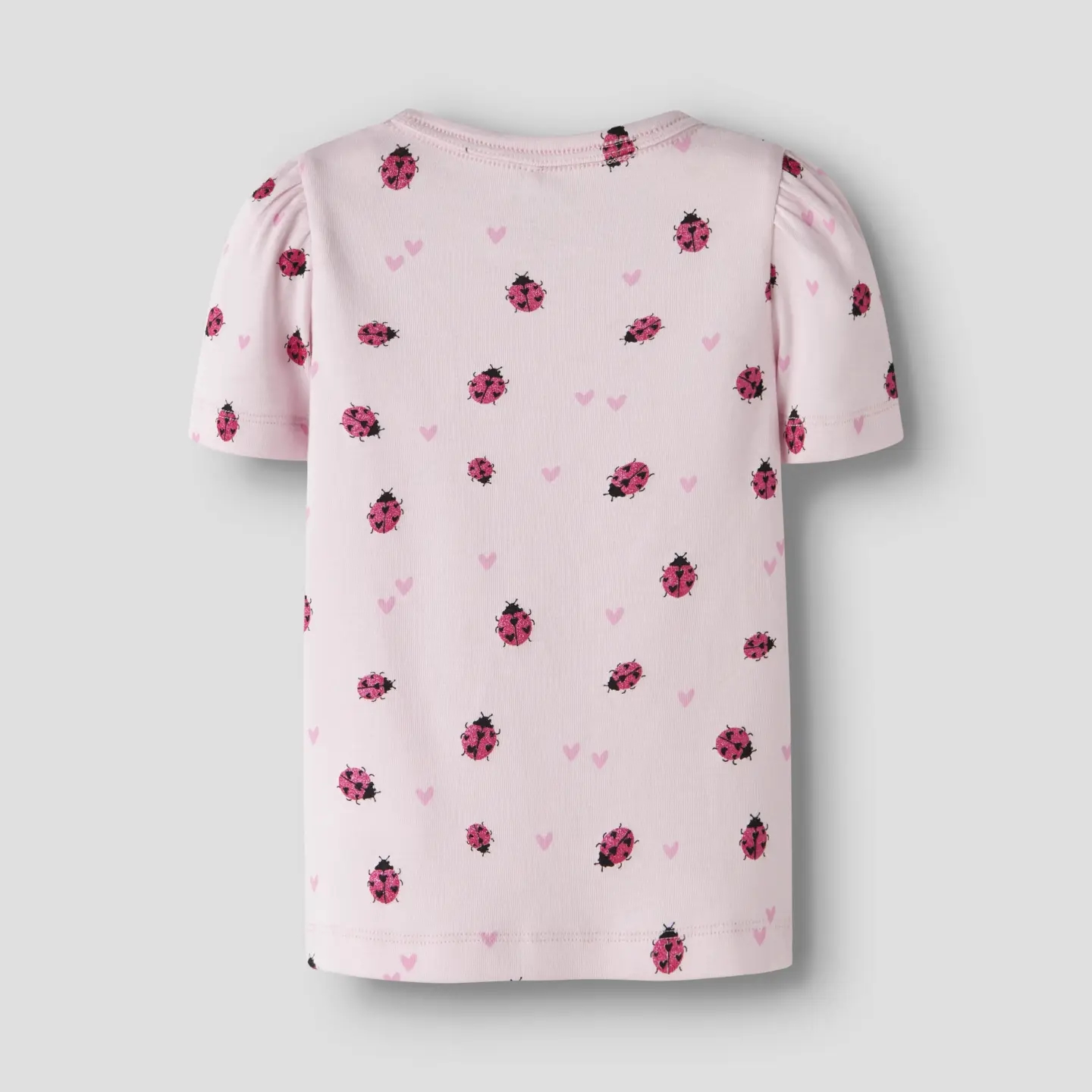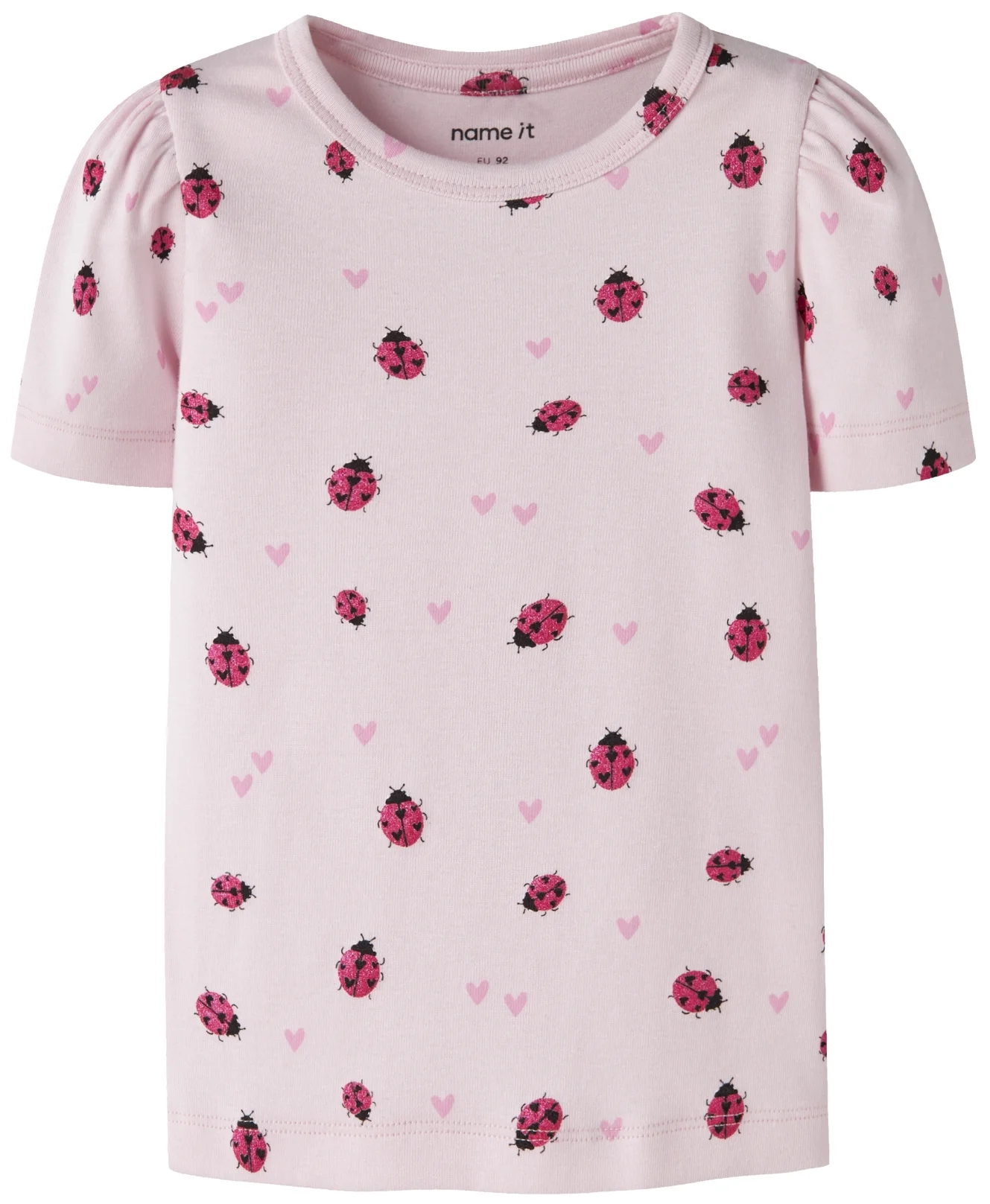 Name It T-shirten er rosa med print af mariehøner med glimmer, samt rosa hjerter. T-shirten har en smule puf på ærmerne, hvilket giver den en sød pasform.
