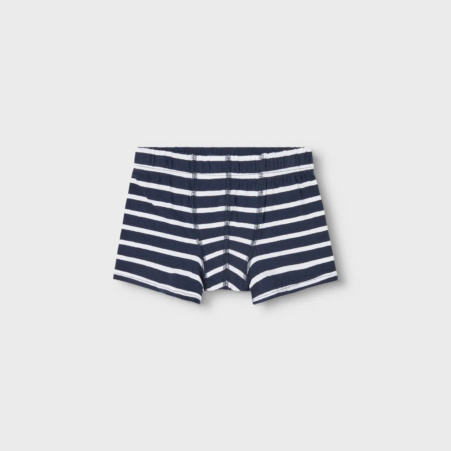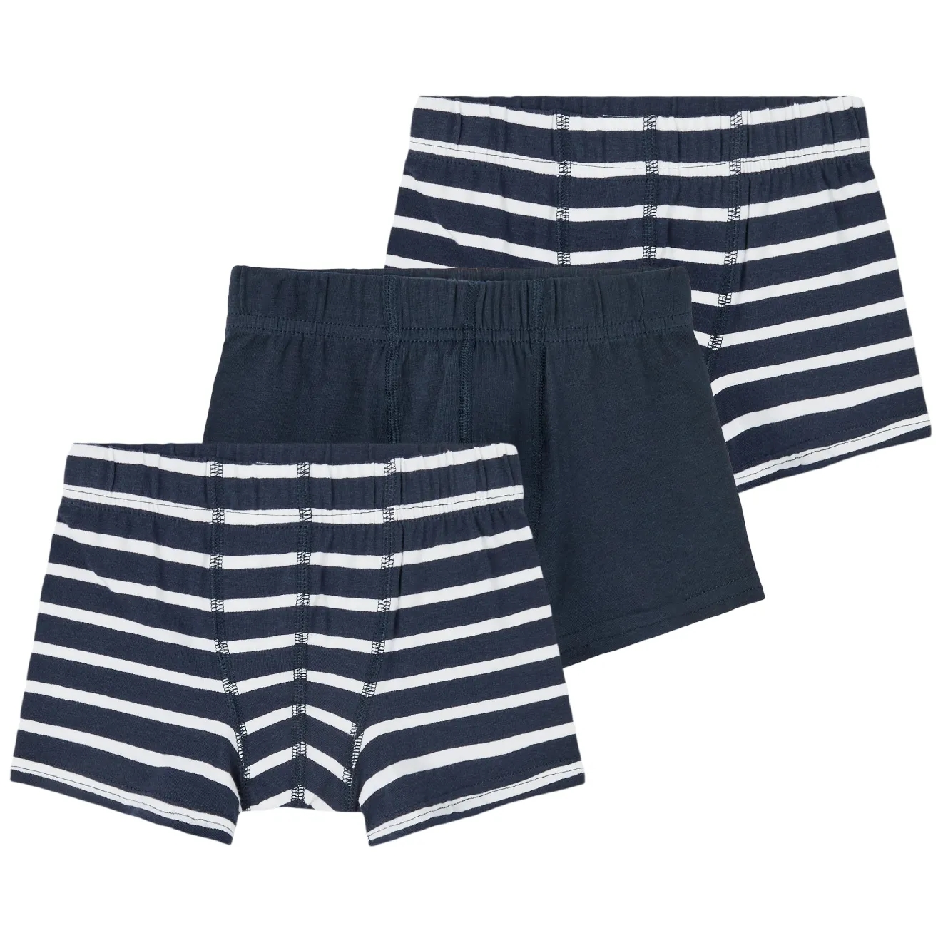 Name It underbukserne består af en i ensfarvet mørkeblå og to i mørkeblå med hvide striber.