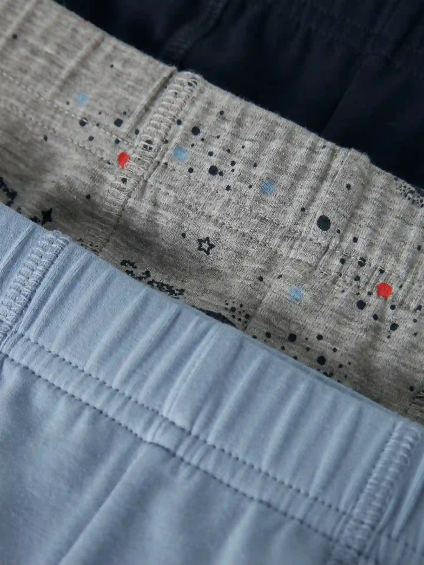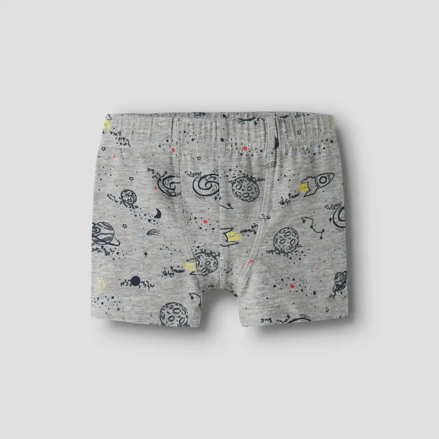 Pakken indeholder et par Name It underbukser i ensfarvet, støvet blå, ensfarvet mørkeblå og en i meleret grå med print af rum-tema med rumraket, planeter og stjerner.