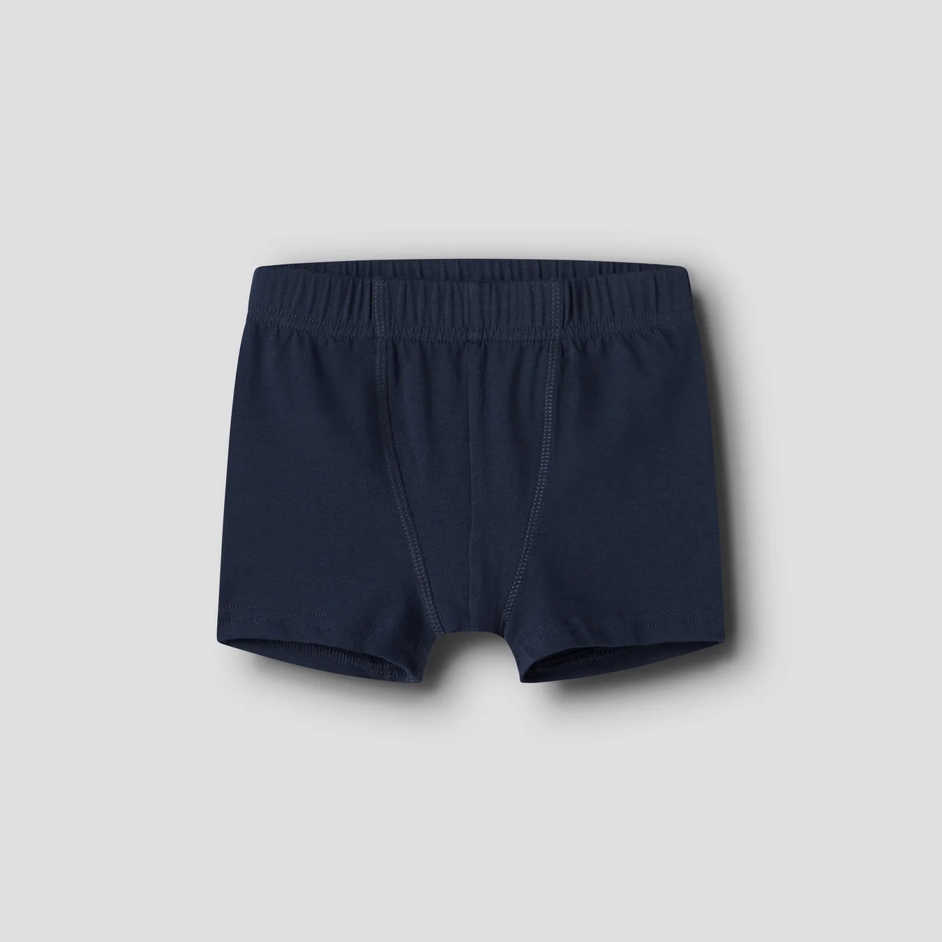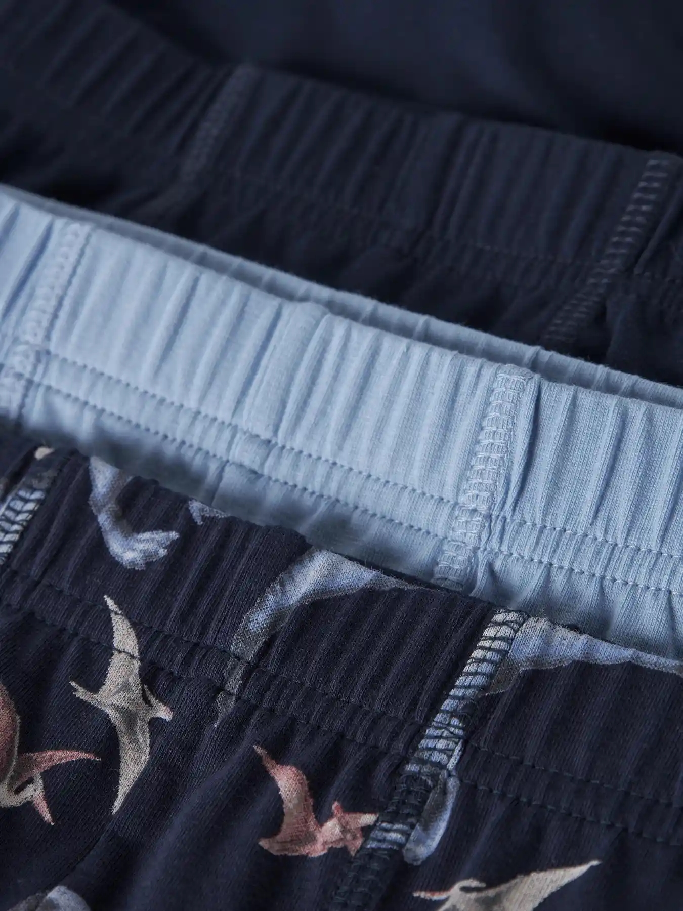 Pakken indeholder et par Name It underbukser i ensfarvet støvet blå,, ensfarvet mørkeblå og en i mørkeblå med et sejt dinoprint.