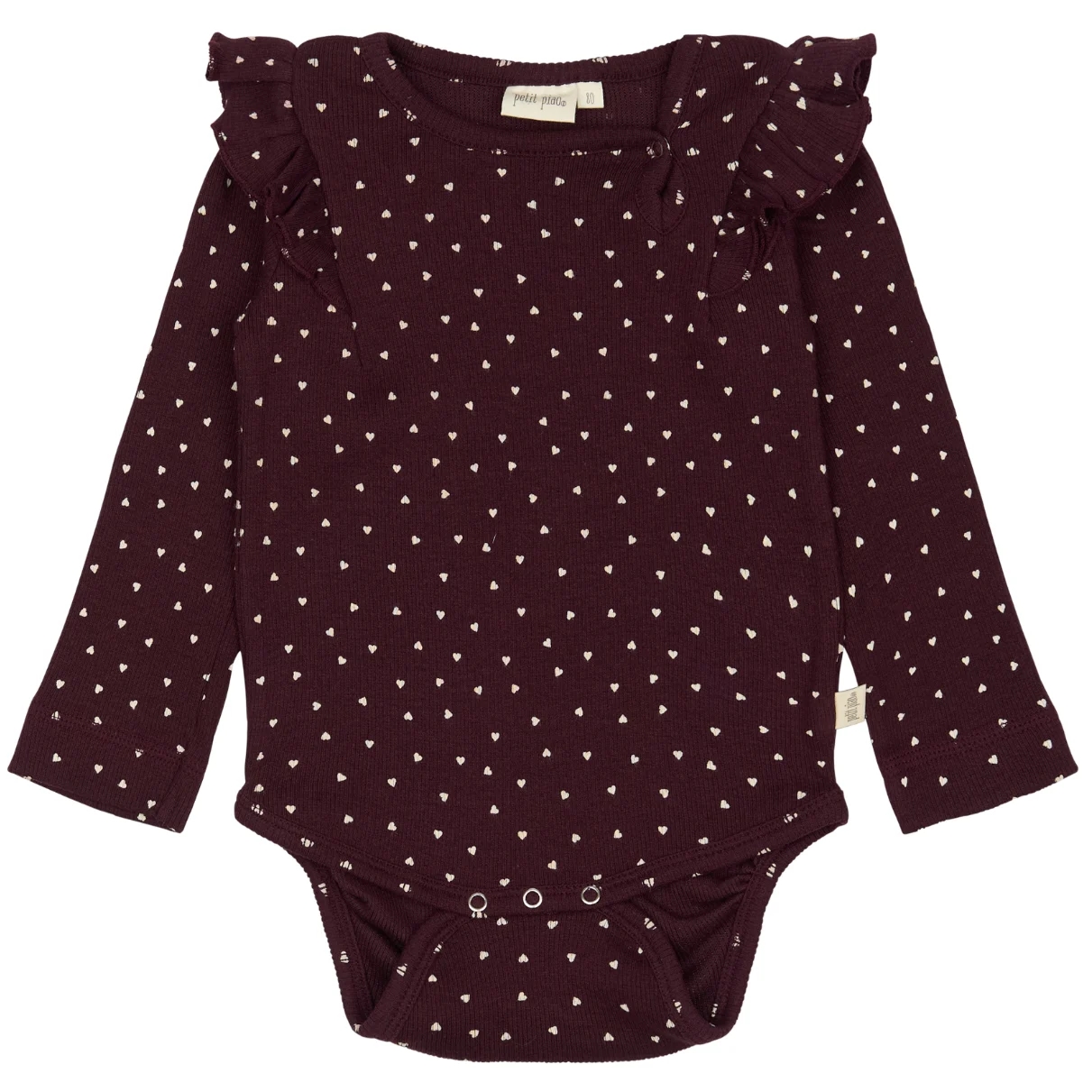 Petit Piao bodyen er i smuk mørkviolet og med små hvide hjerter.