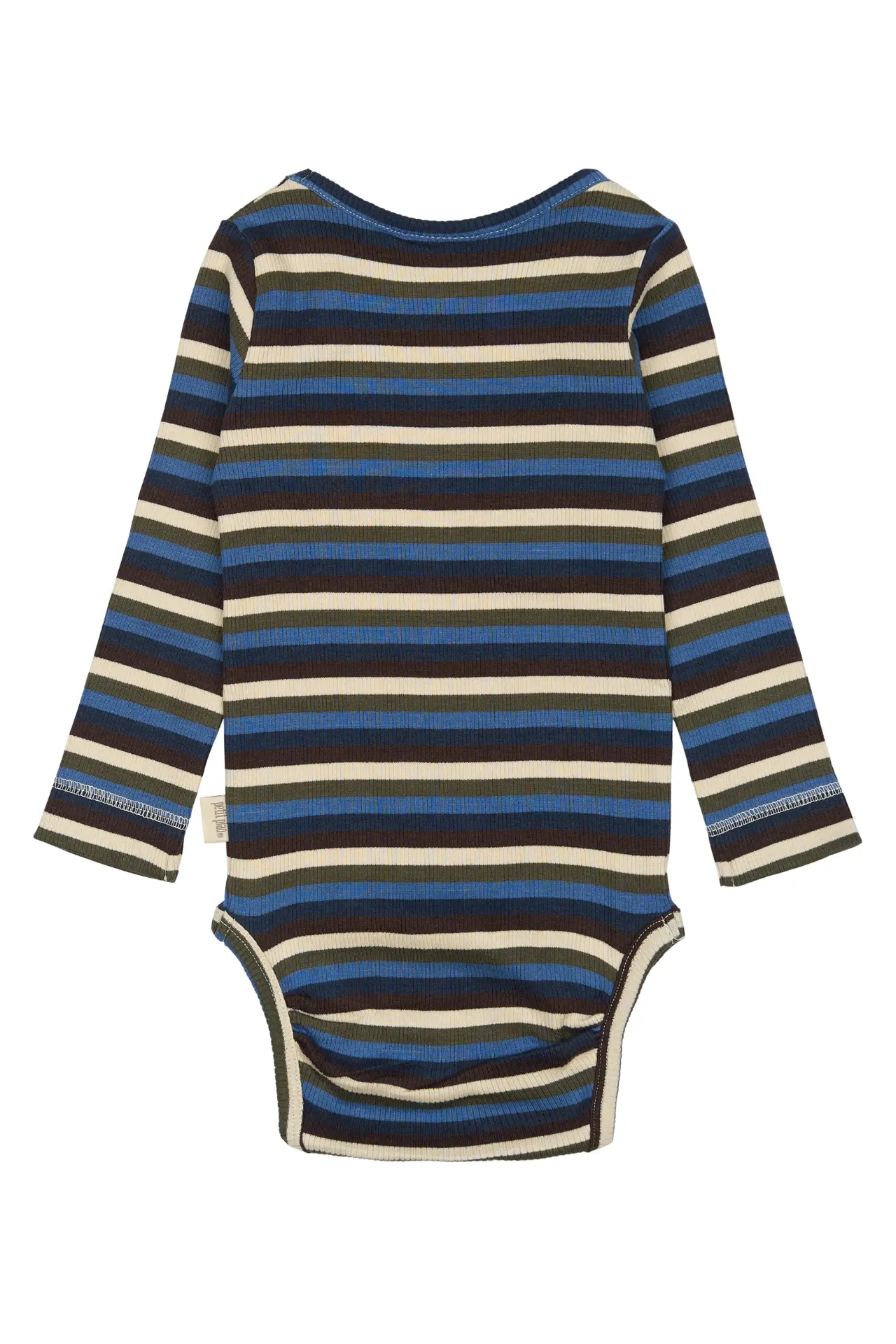 Petit Piao bodyen er med striber i flotte blå, brune, grågrønne og cremehvide nuancer.