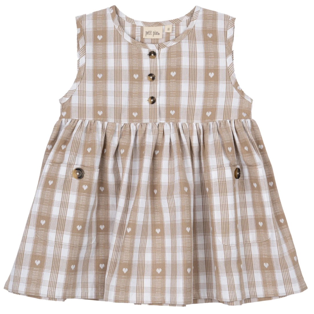 Petit Piao kjolen er vævet i økologisk bomuld i flotte beige og off white nuancer med fine hvide hjerter.