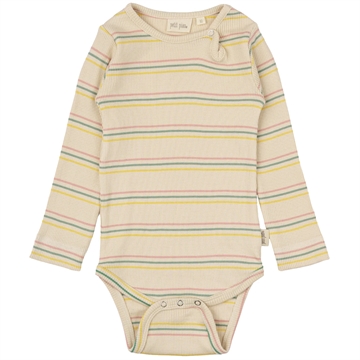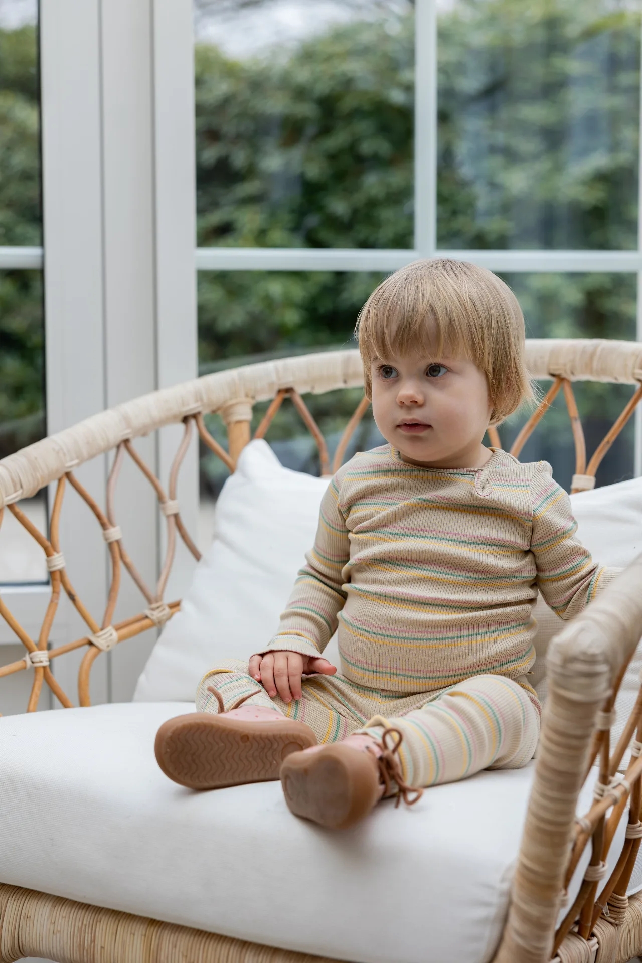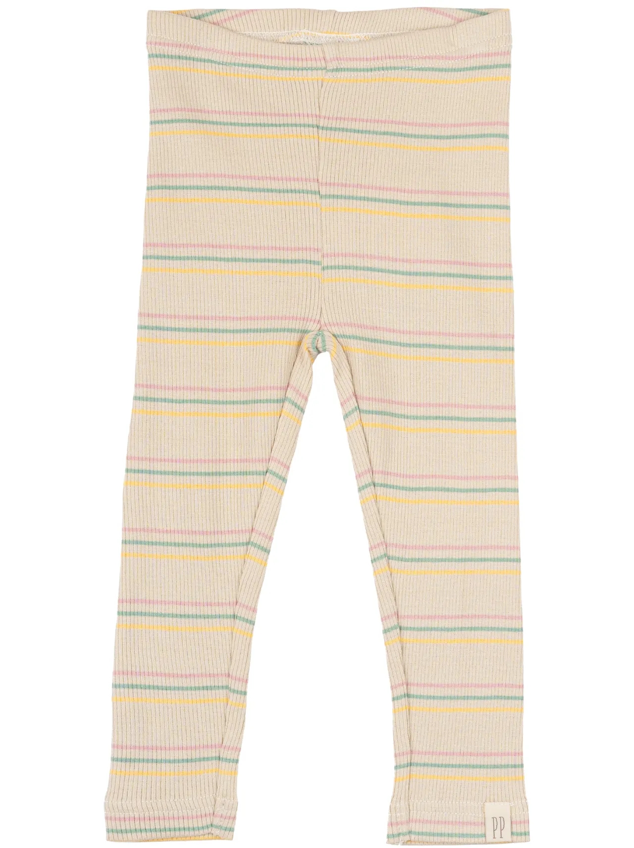 Petit Piao leggingsene er i en fin, lys beige med tynde striber støvet rosa, grøn og gul.