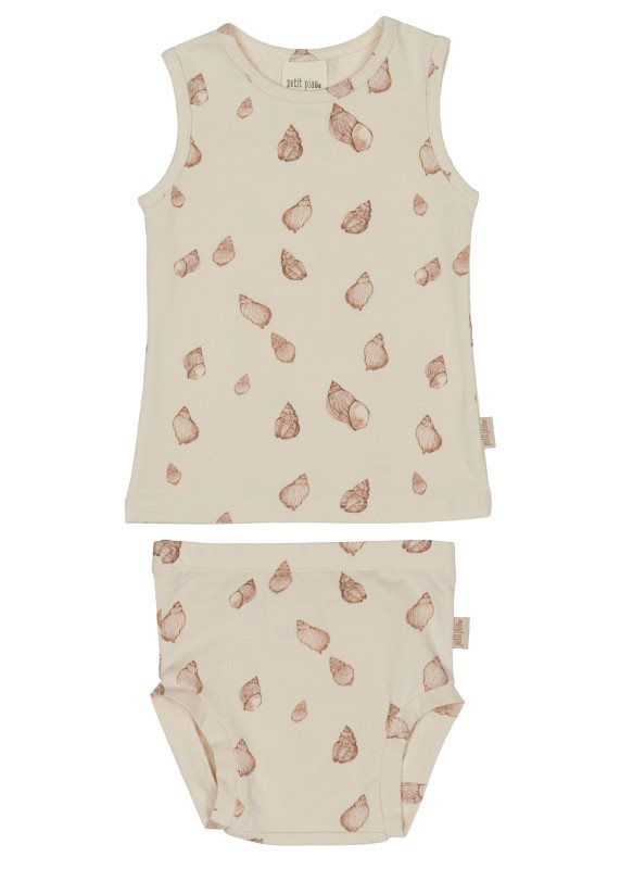 Skønt undertøjssæt fra Petit Piao med det fine Seashell print. Undertøjet består af en undertrøje og underbukser, som er dejlig bløde og behagelige.