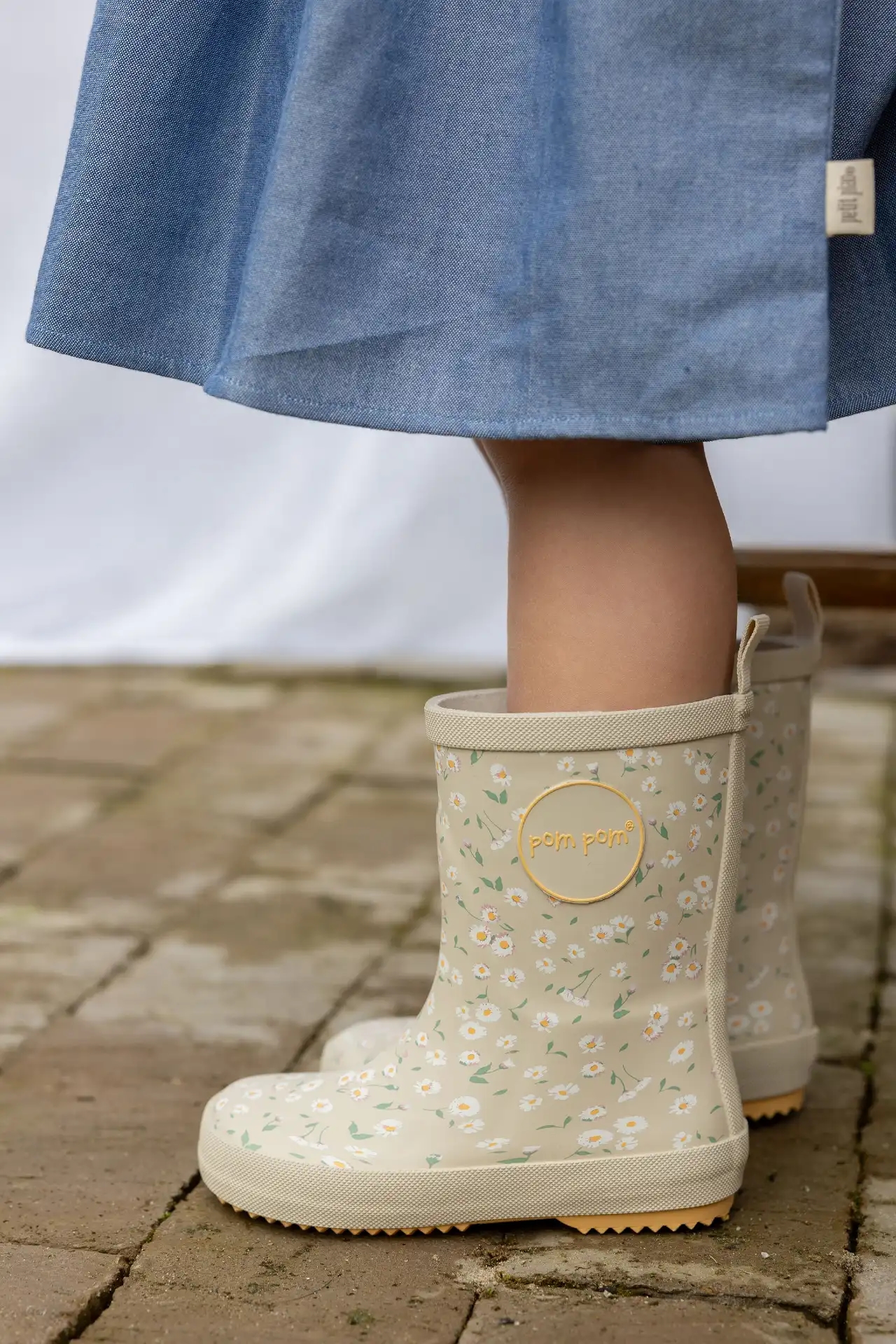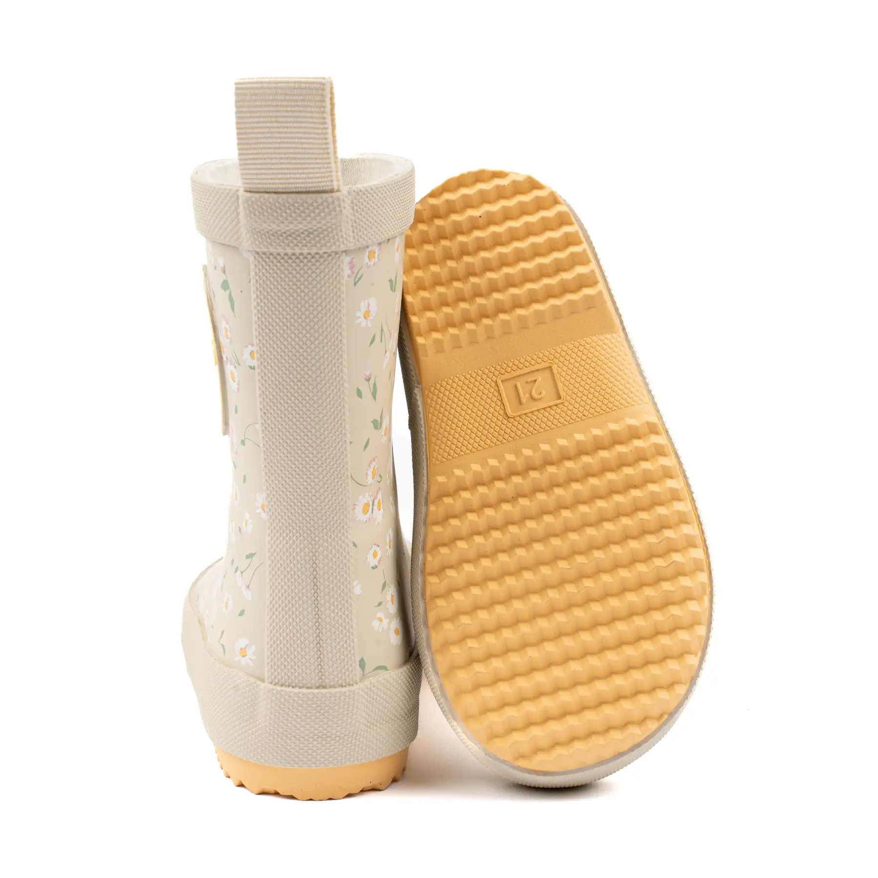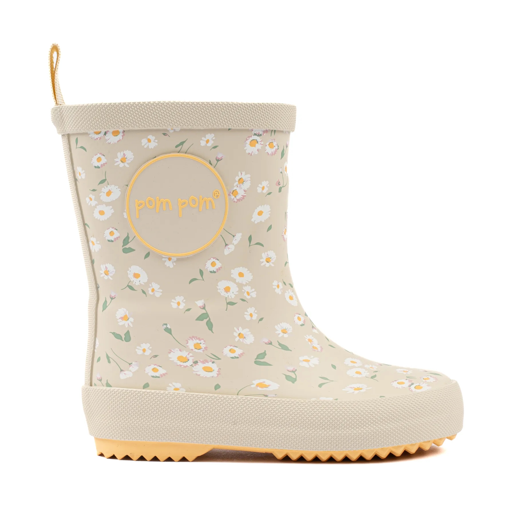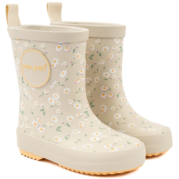 Flotte Pom Pom gummistøvler i beige med smukt alloverprint af tusindfryd med en gul ydersål.