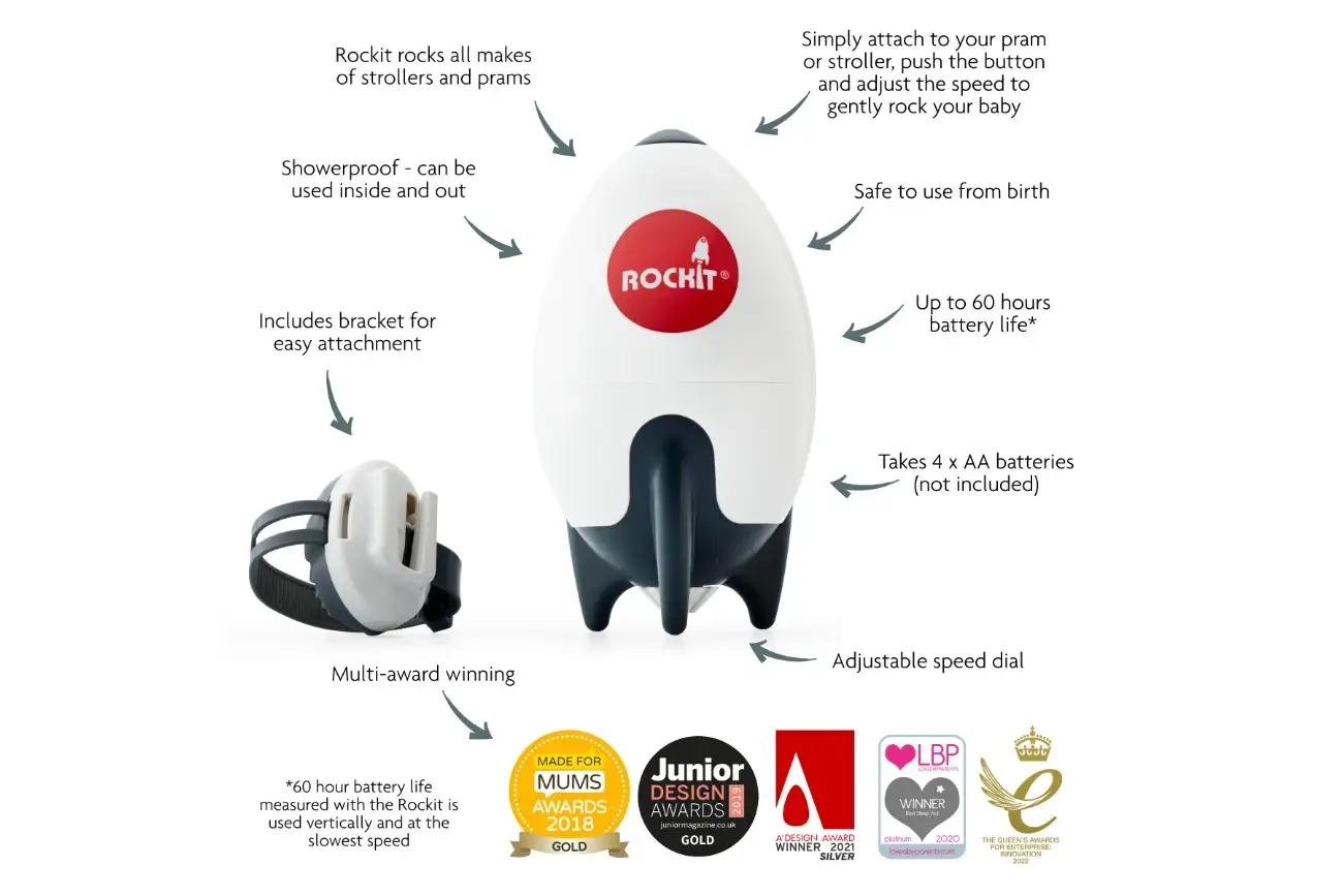 Den nye og forbedrede Rockit barnevognsvugger er genopladelig og leveres med et helt nyt og forbedret beslag, som gør Rockit endnu bedre. Den nye Rockit barnevognsvugger laver beroligende, gyngende bevægelser med 60-minutters cyklus, og hjælper barnet med at falde i søvn og sove længere.
