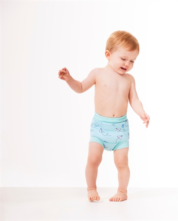 Populære Splash About badebukser i en flot lyseblå farve med med små papirflyvere.