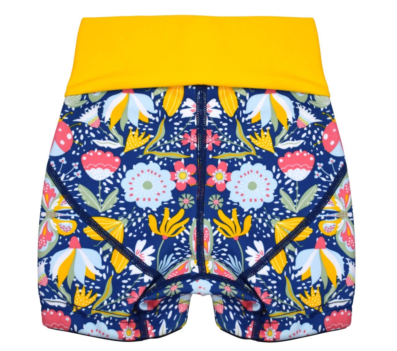 Smarte Splash About badebukser i navyblå og gul med et print af blomster, planter og dyr.