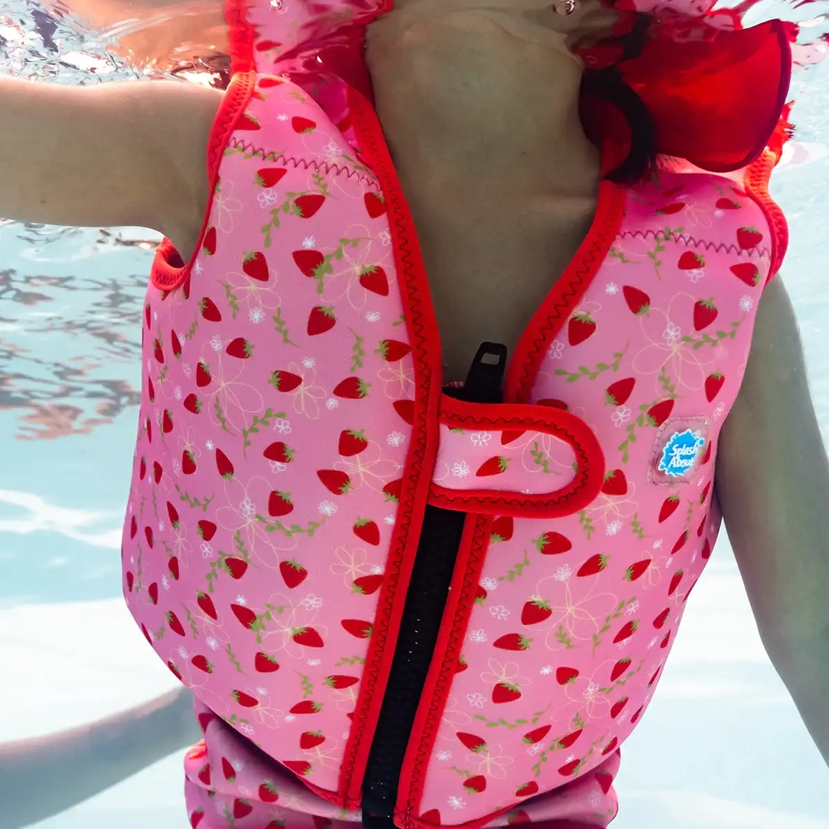 En fin Splash About svømmevest i rød og rosa med jordbærprint.