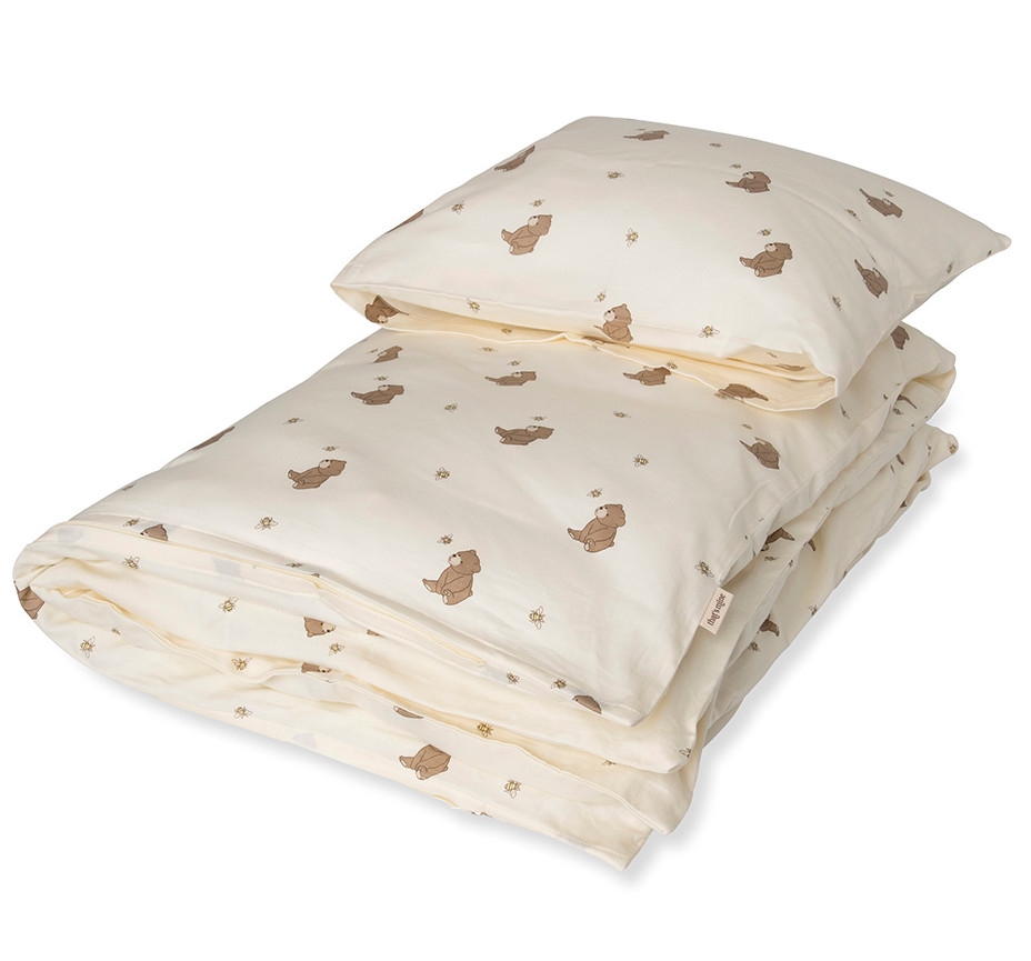 Sengetøjet er i cremehvid og med det fineste print med søde bamser og bier.