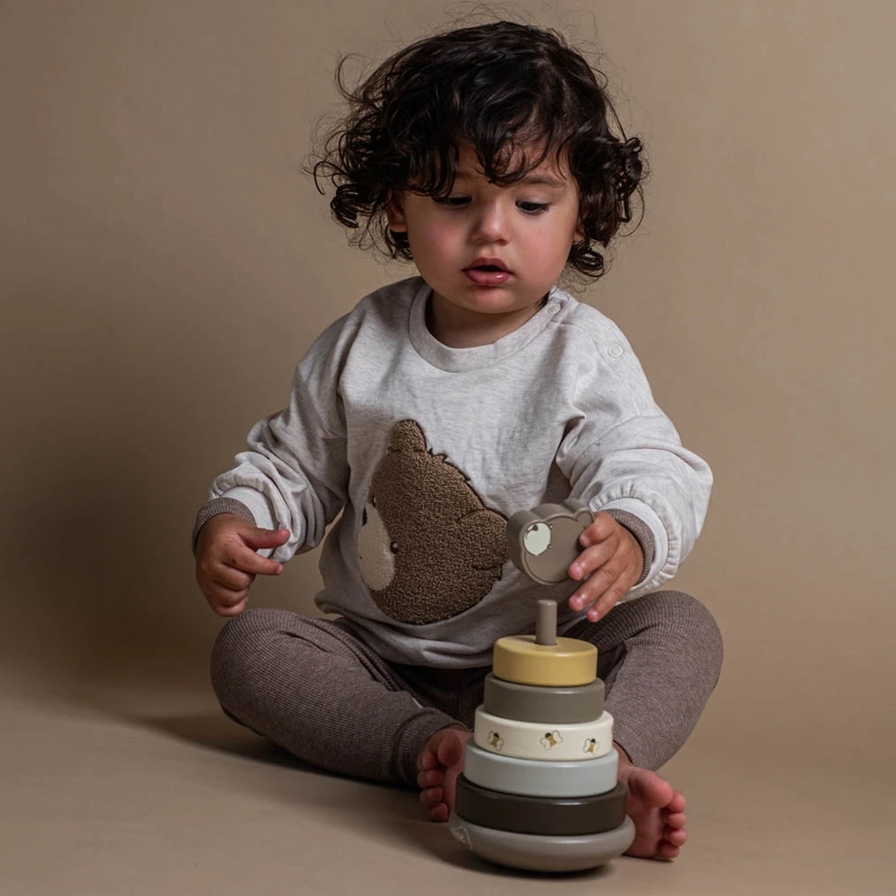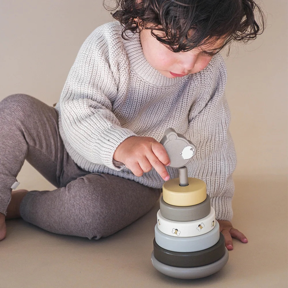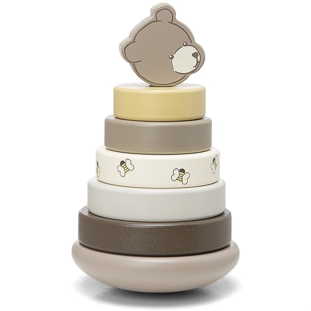 Thats Mine stabeltårnet er i flotte rolige farver og har 5 stable ringe i forskellige farver og størrelser. Den ene træring er med små bier, og i toppen afsluttes den med det søde bamsehoved.