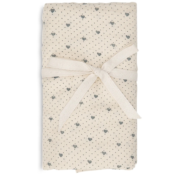 Thats Mine svøbet er i cremehvid og med fint print med små hjerter og prikker i støvet blå.