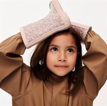 Wheat gummistøvlerne er med et smukt blomsterprint i rosa og lilla, samt en rosa kant og bund.
