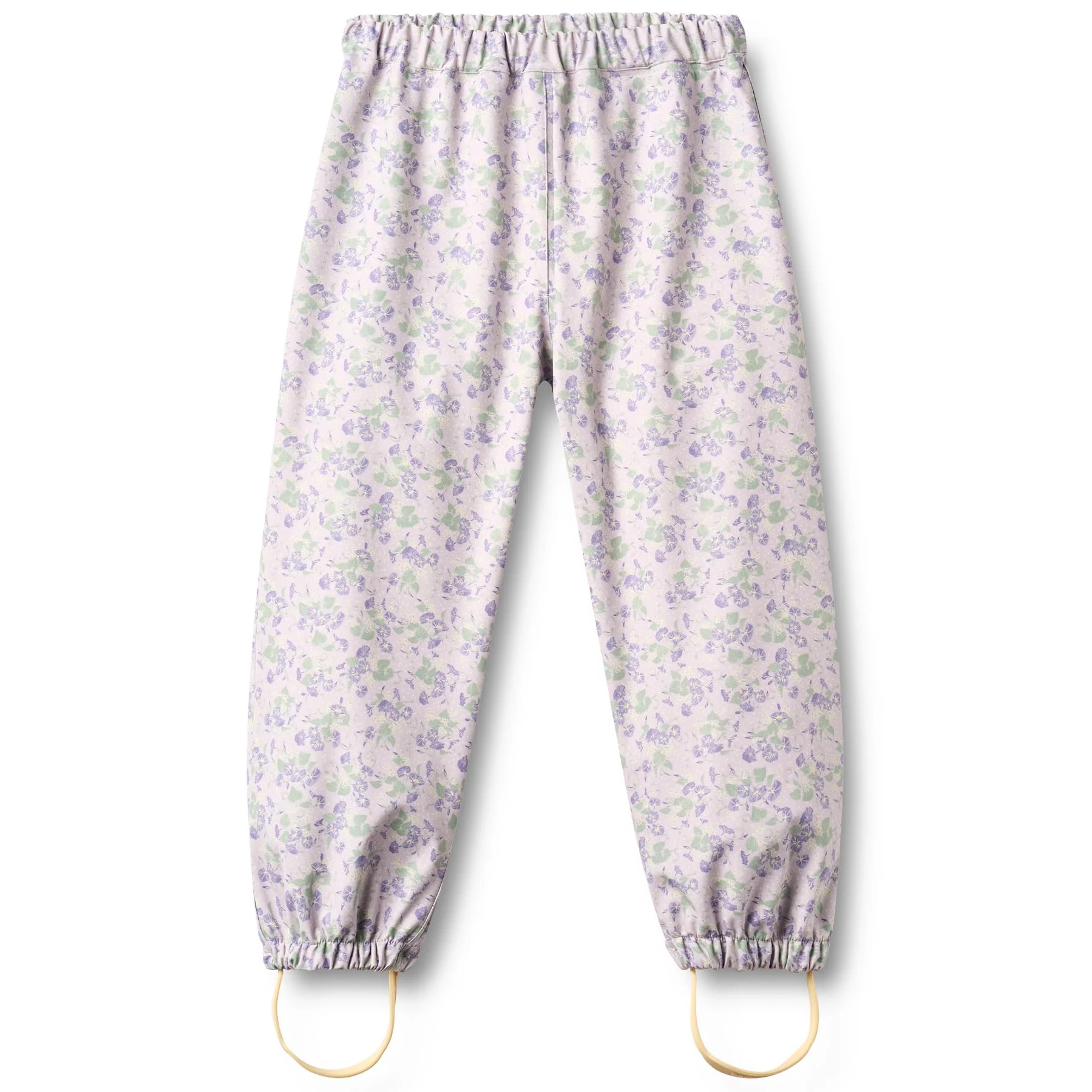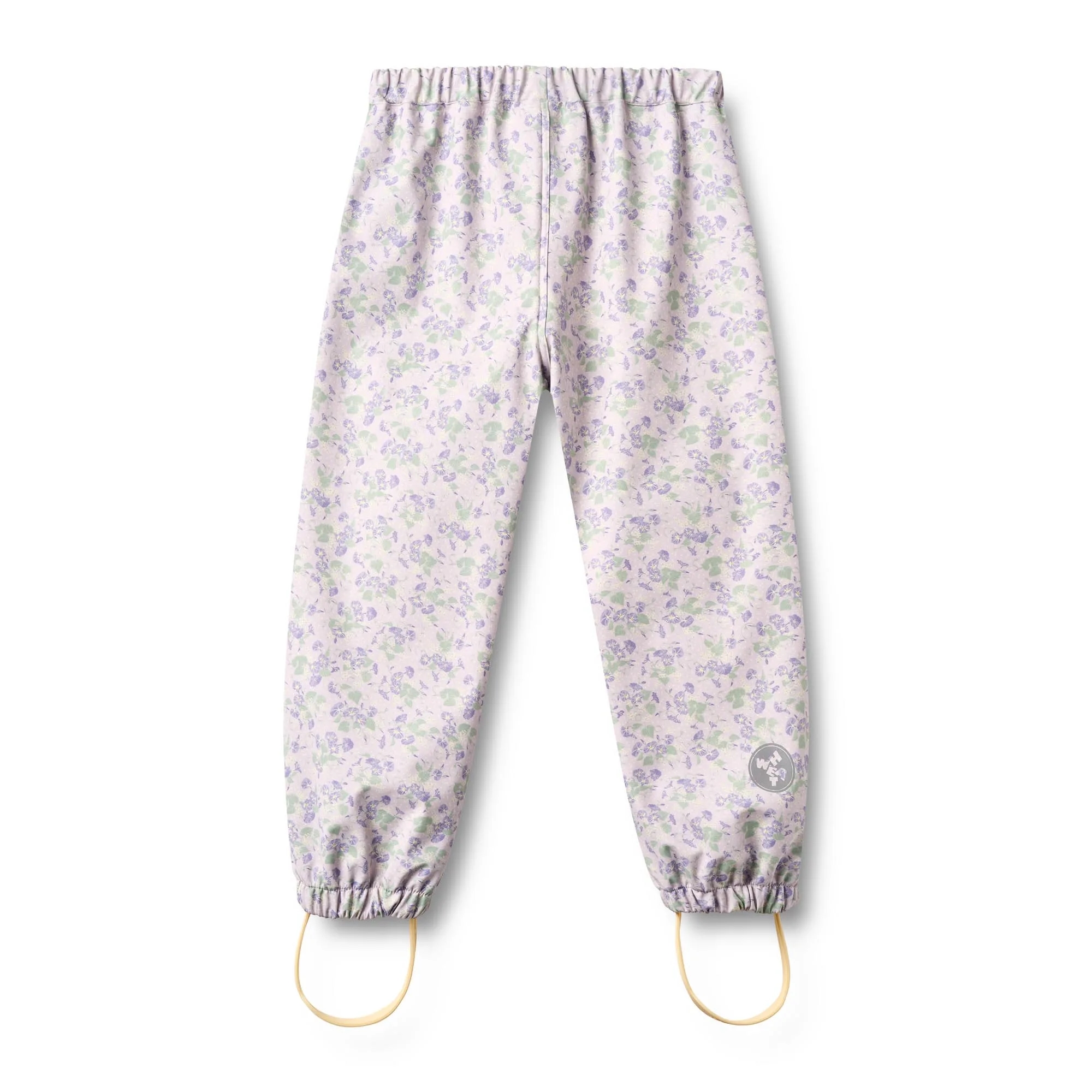 Praktiske Wheat regnbukser i lilla med et smukt blomsterprint i lilla og grøn.