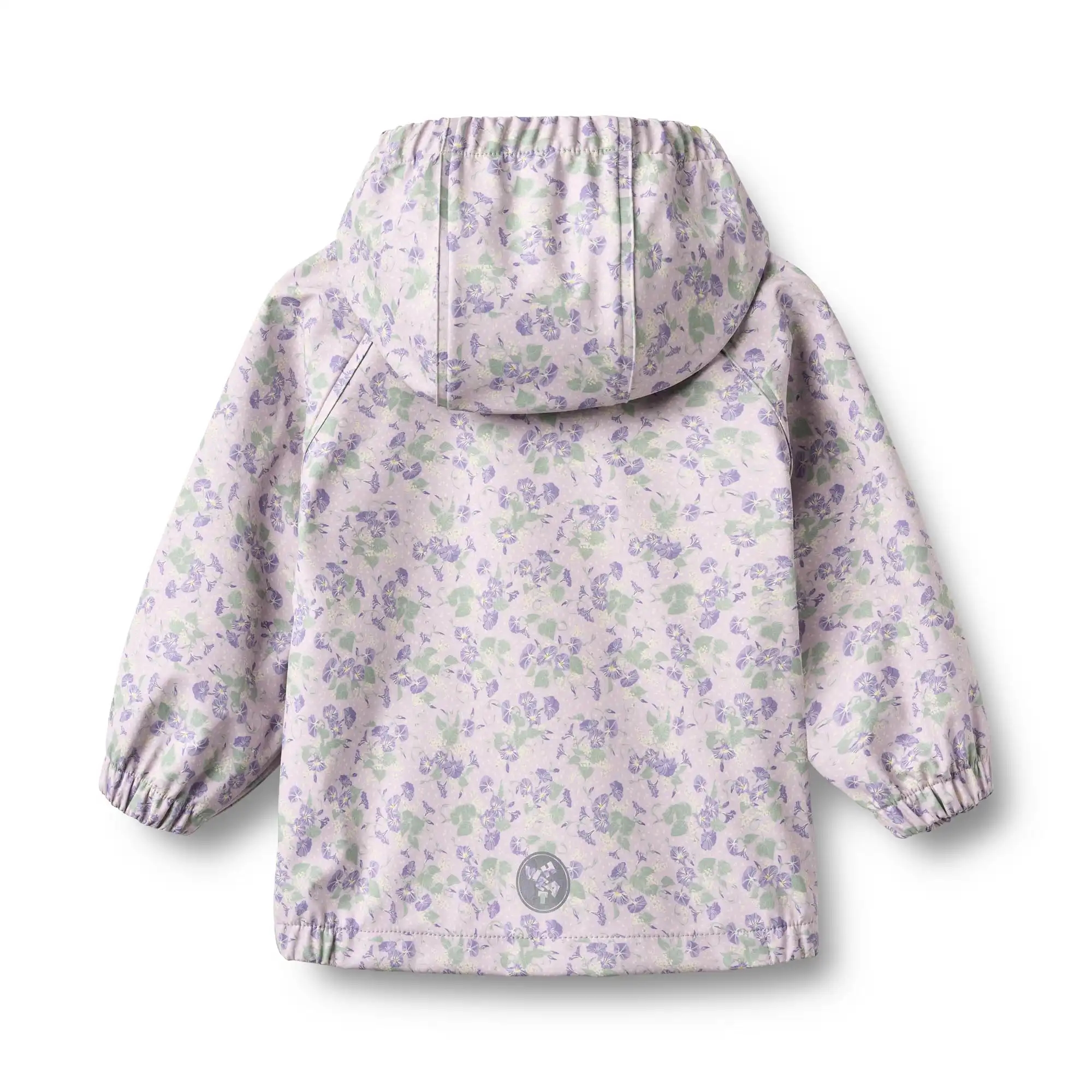 En praktisk Wheat regnjakke i lilla med et smukt blomsterprint i lilla og grøn til de mindste op til størrelse 92.