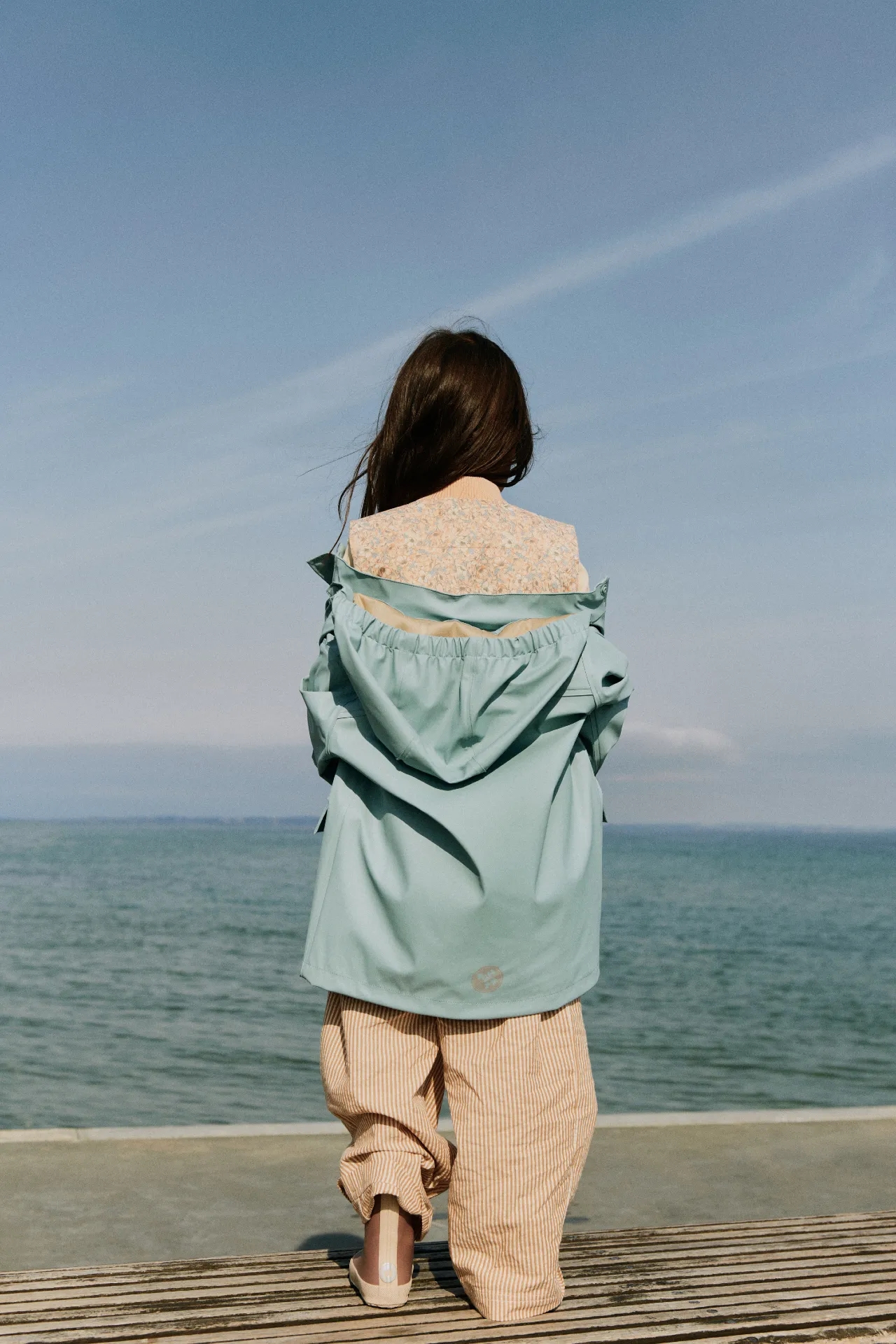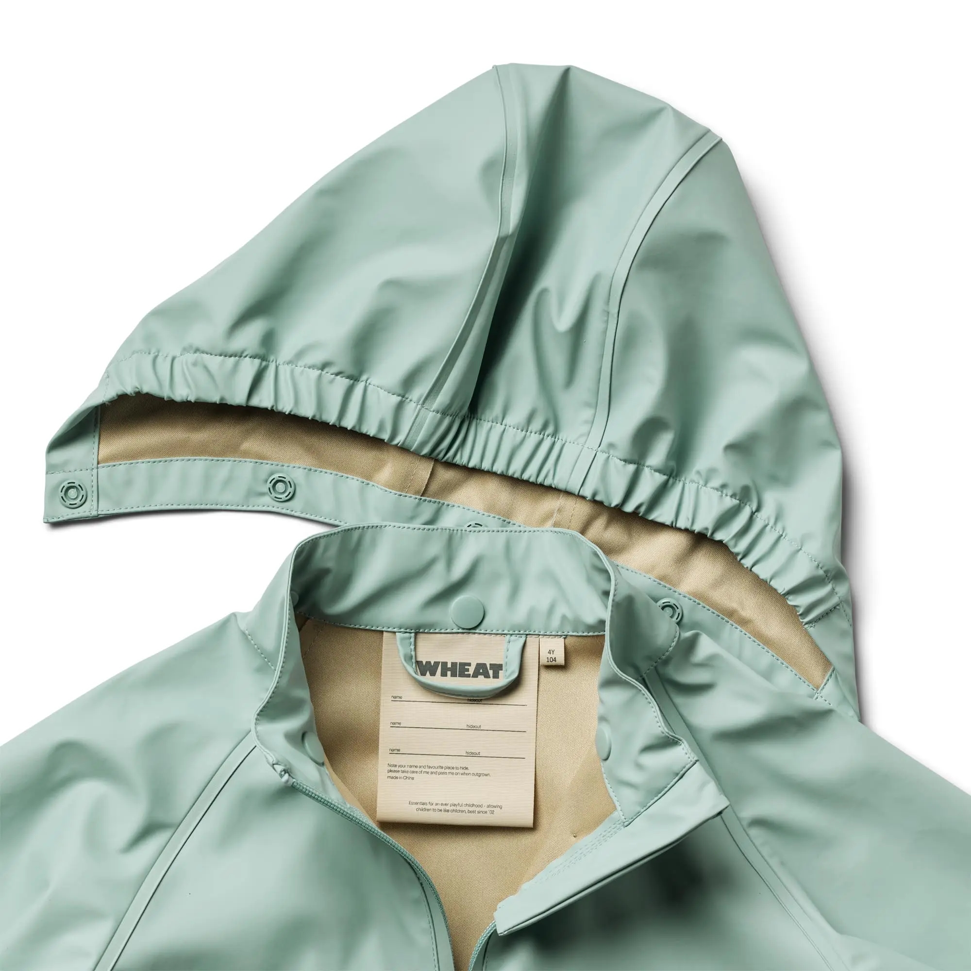 Wheat regntøj er lavet i et superblødt og let materiale, der gør det behageligt at have på og bevæge sig rundt i. Regnjakken er vandtæt og smudsafvisende og er derfor nemt at rengøre med en våd klud efter en mudret dag på legepladsen.