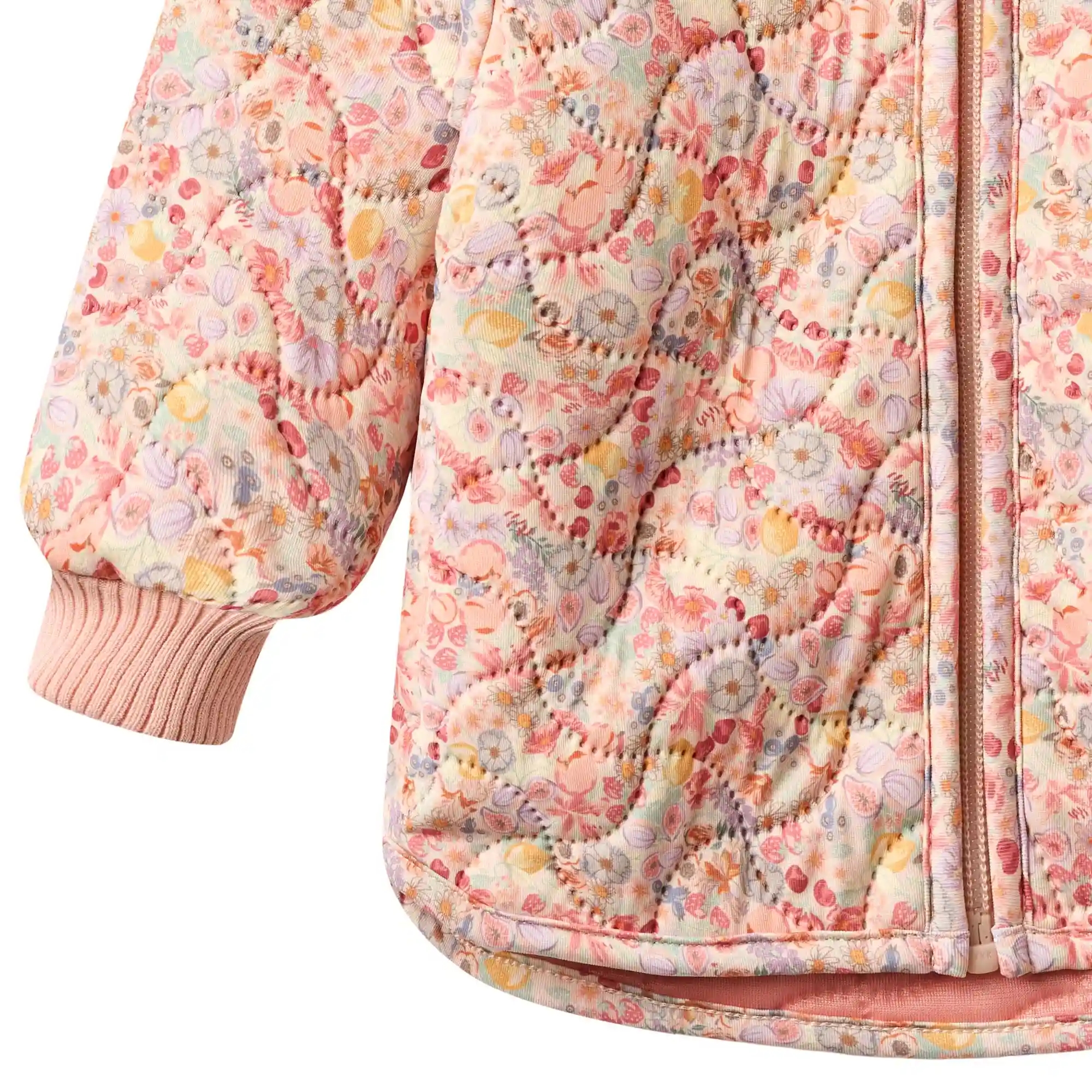 Wheat termojakken er med print af små frugter og blomster i smukke pastelfarver og er lavet med quiltet struktur i 3-lags materiale for ultimativ isolering.