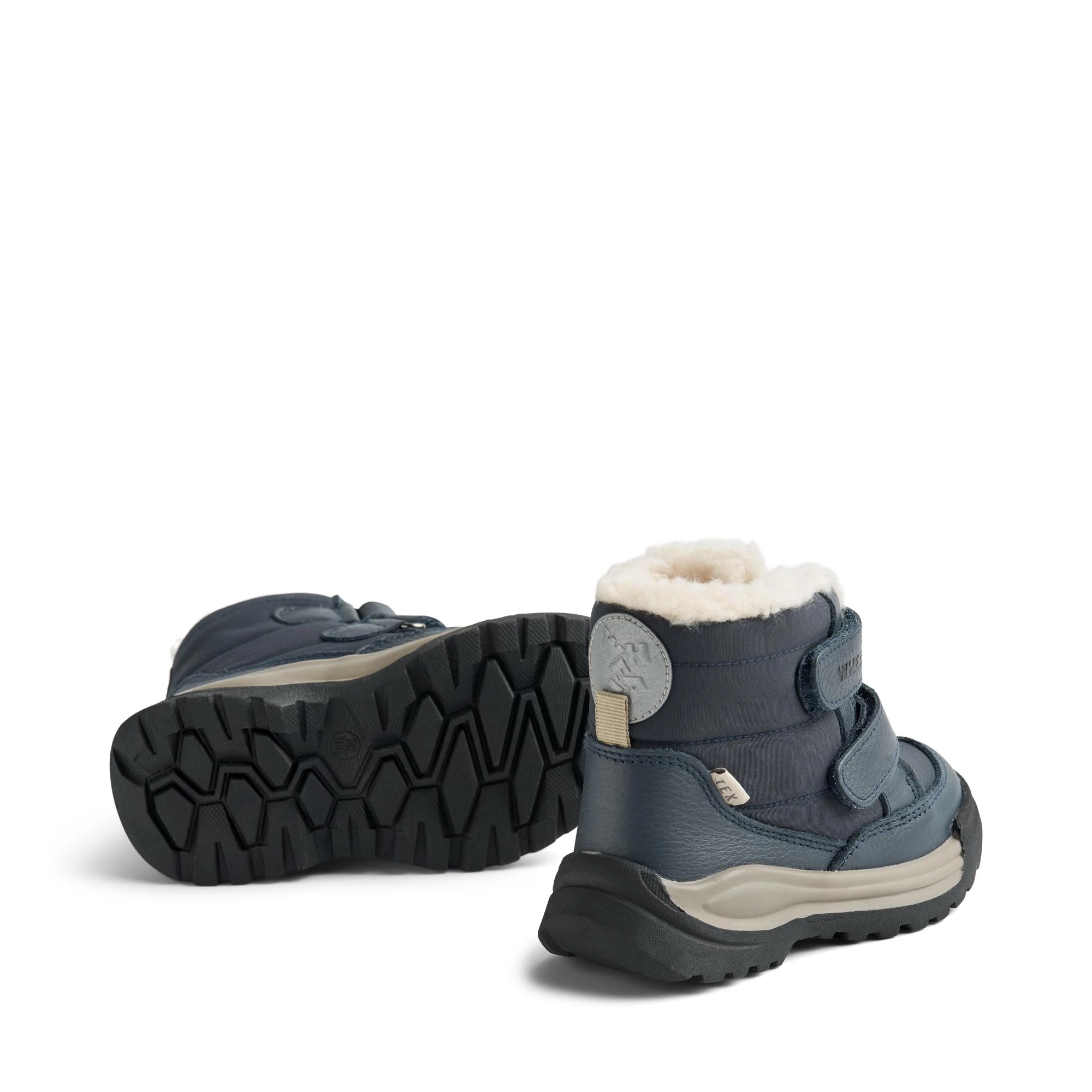 Lækre og varme Wheat vinterstøvler i flot navy blå med uldfoer, dobbelt velcrolukning og Tex-membran.
