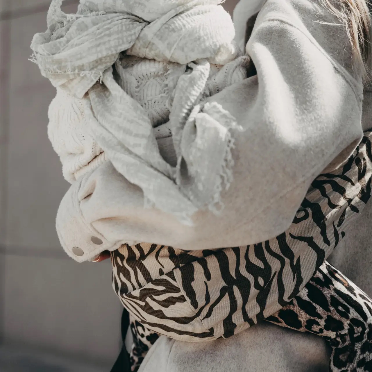 En lækker Wildride bæresele med zebra print og sort bælte.